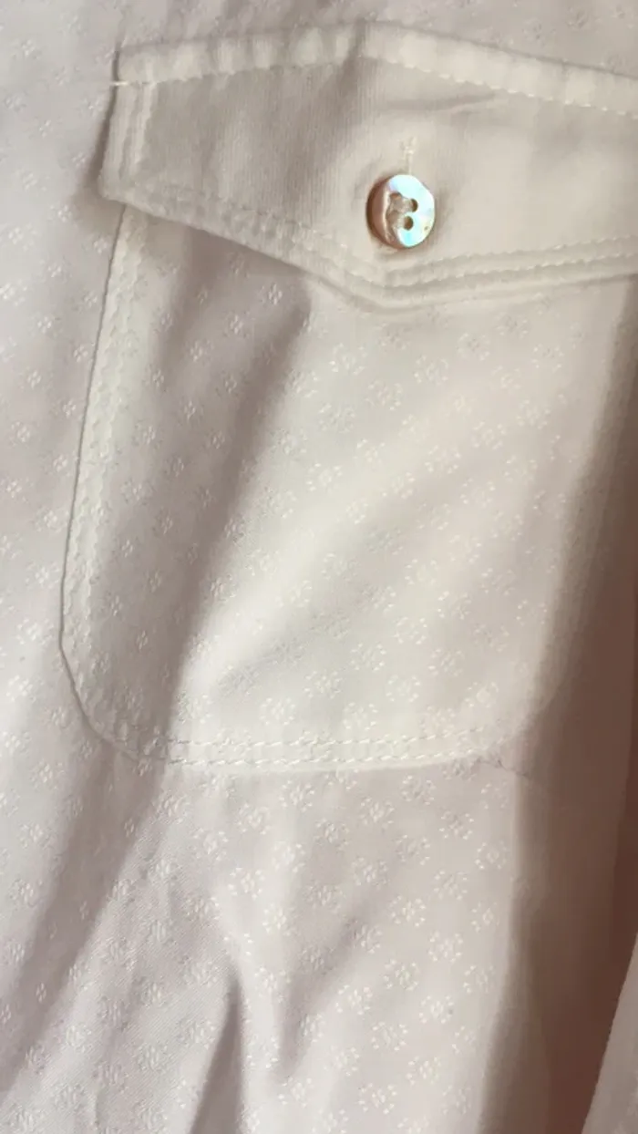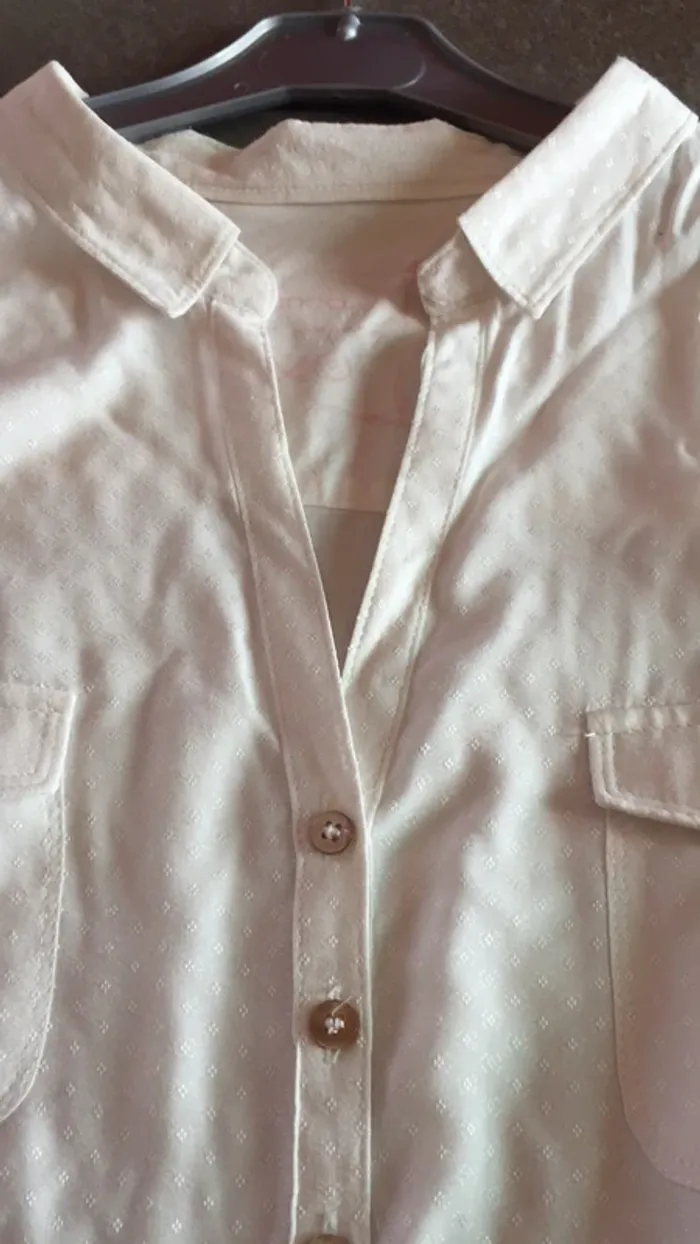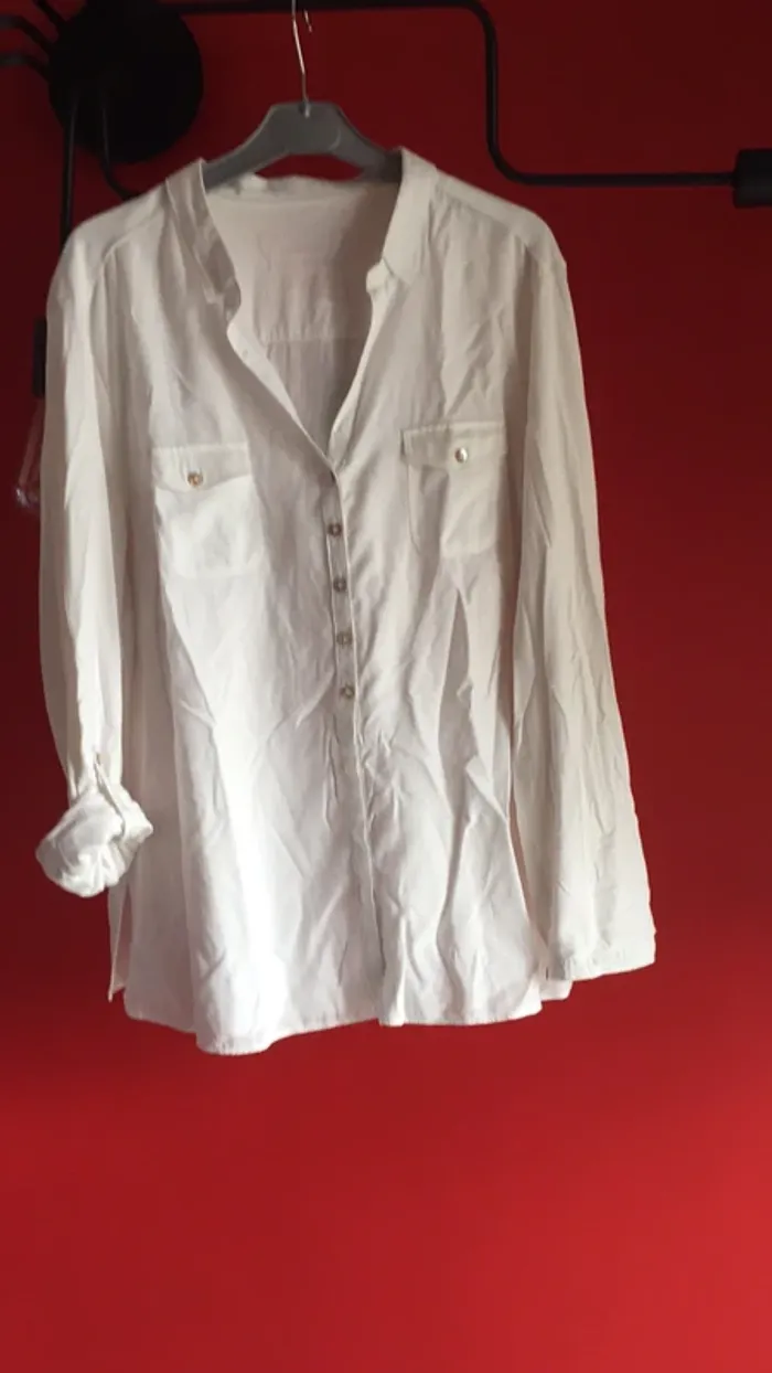 vends une chemise femme de marque Bianca en XL blanche. Manches retroussables par patte et bouton , deux poches poitrines . Deux matières et aspects : le devant plus col, sauf dessus des poches , le bas des manches que l’on peut fermer avec deux boutons ( photo5), et le haut du dos ( comme la photo 2avec petits reflets brillants...) et matière uni elasthanne pour le bas du dos et les manches ( photo 3). Longueur 70 cm