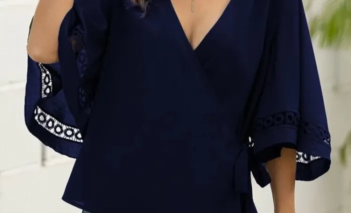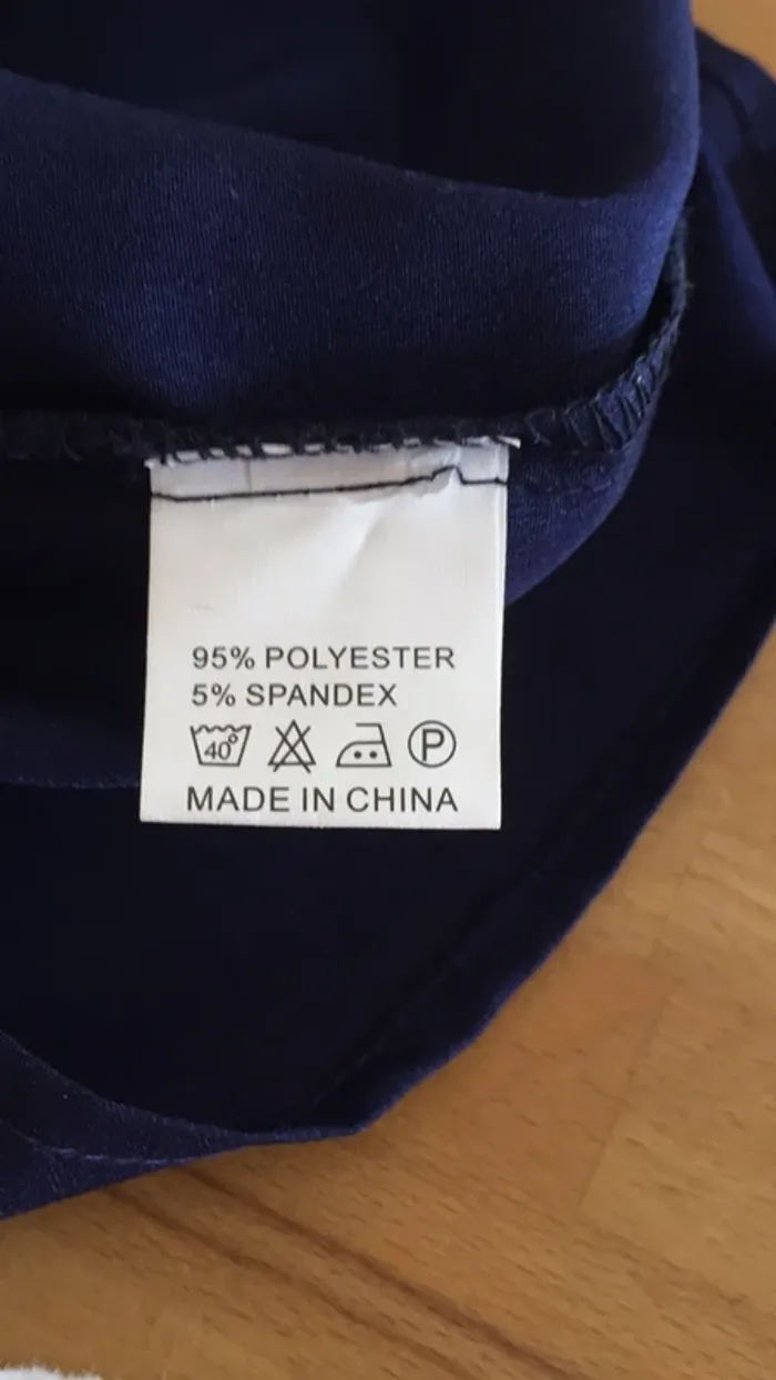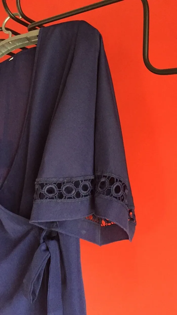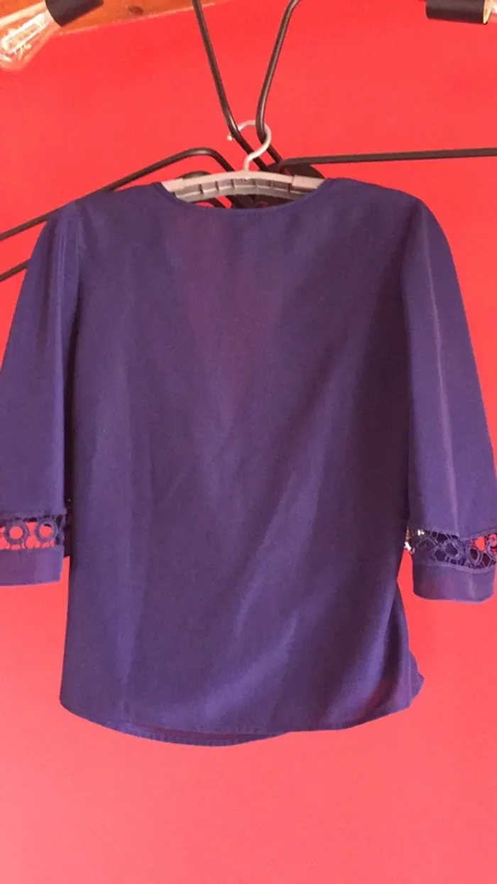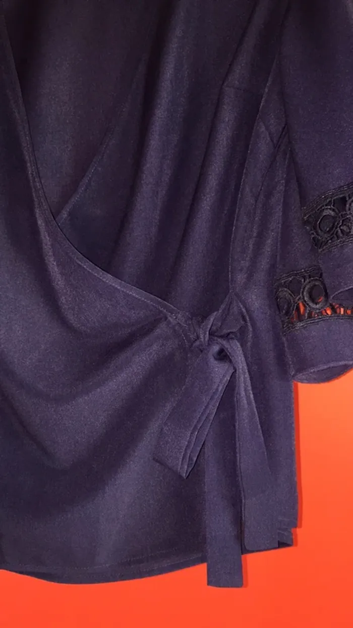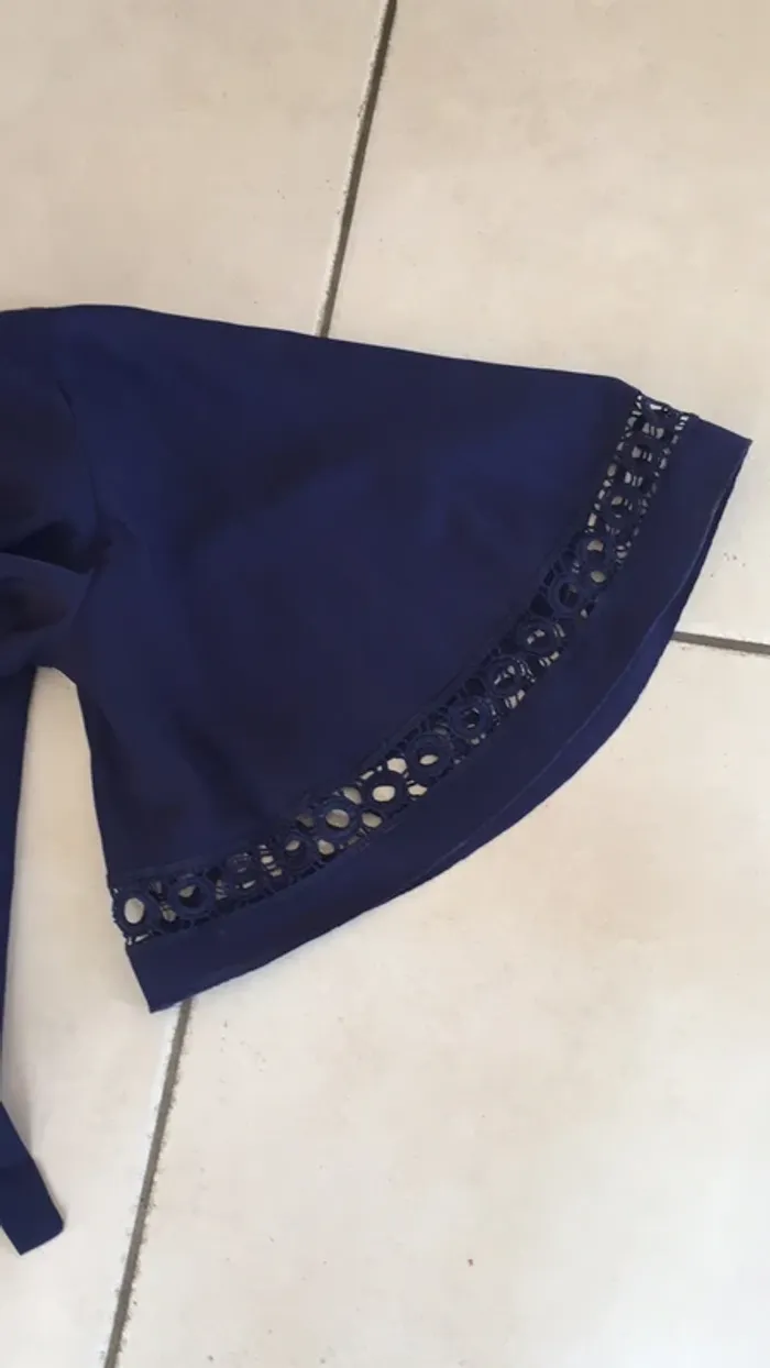 vends une blouse de couleur « bleu marine »en 95% polyester 5% élasthanne ( spantex ) non transparente et taille S .. Se ferme croisée avec une patte permettant de faire un noeud sur le côté ( photo 4 )et faisant un très beau col V . Particularité qui en fait son originalité : les manches ( photo 2 et 6 pour le détail) puisque ajourée et belle forme 😏👍. Longueur 60 cm ;carrure 39 cm ; longueur manches 38 cm en partant de l’épaule . Je m’en sépare à contre coeur car Acheté et m’a été offerte (en solde et bien sûr non reprise 😬), mais un peu trop grande ( j’ai un 90 B de poitrine , et il en aurait fallu un peu plus pour que le croisé ne baille pas 👀😀) . je la laisse à 15€ 😊
