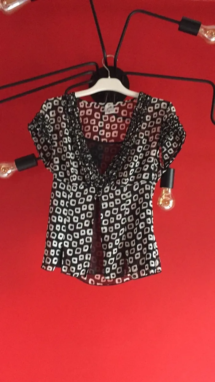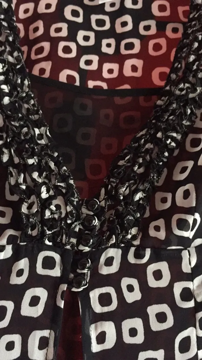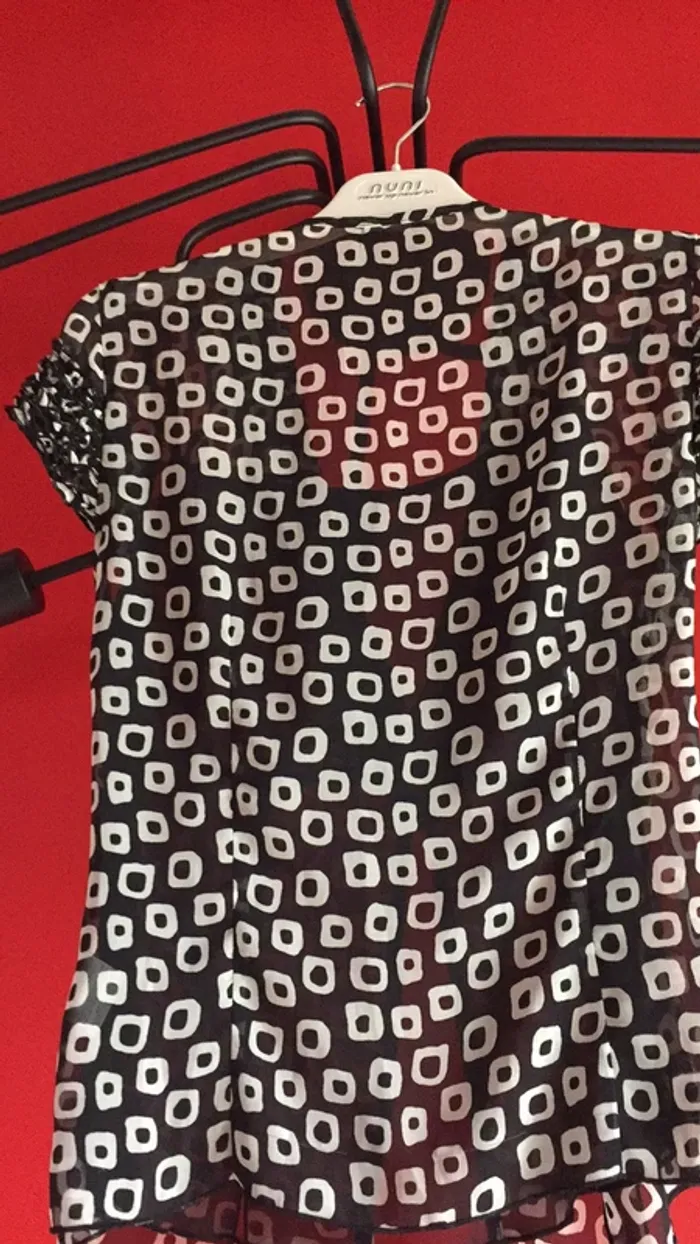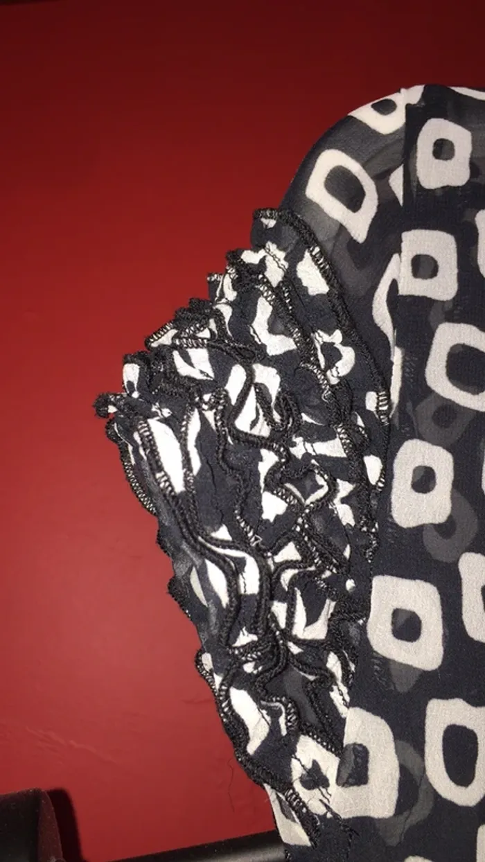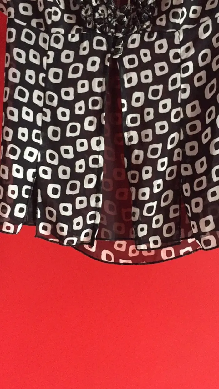 vends un chemisier noir et blanc de Jaqueline Riu . décor devant comme aux manches. doublé d’un voilage sur l’avant , cinq petits boutons, fentes en bas à l’avant , et arrondis sur les côtés. Dos cintré , et en taille 38 . 100% polyester .