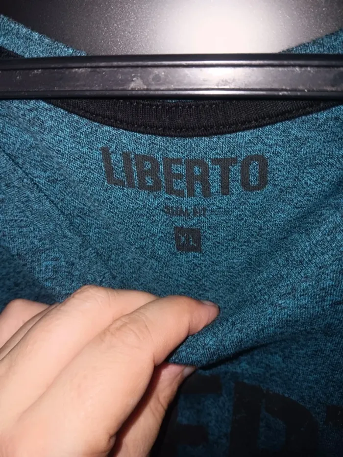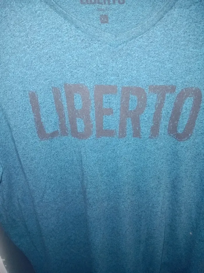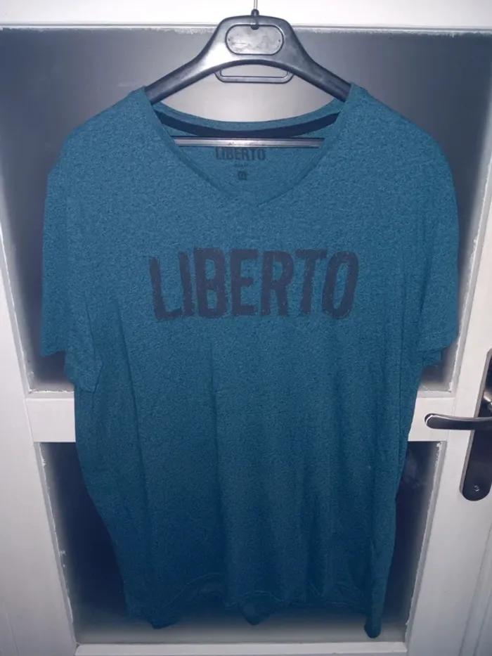 T-shirt bleu de la marque LIBERTO, modèle à col rond, imprimé du logo sur la poitrine, en tres bon état général. Taille XL