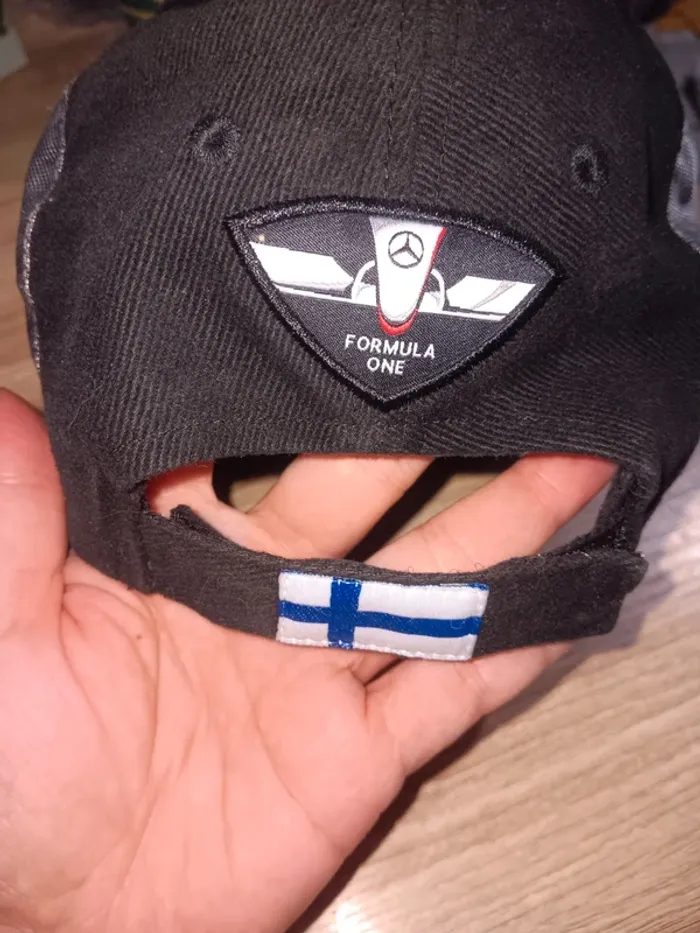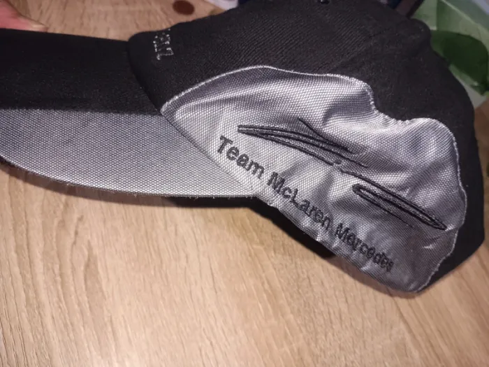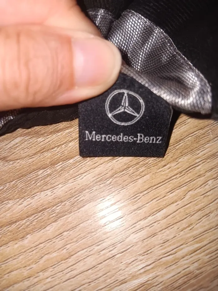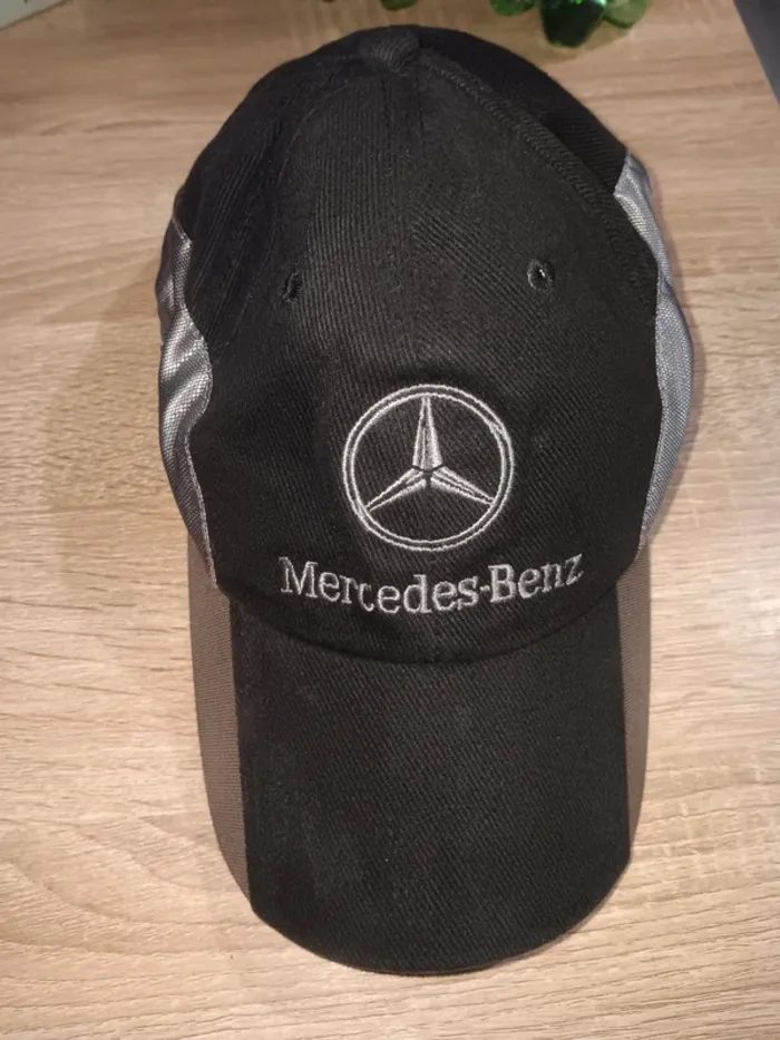 Casquette noire Mercedes-Benz en tissu, broderie logo et nom, bandes grises sur les côtés. État neuf, finition soignée, idéale pour les passionnés de la marque. Taille S 55/57 cm adulte