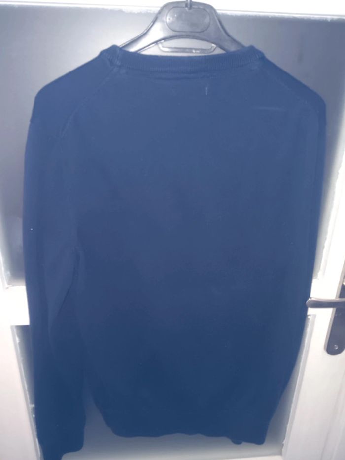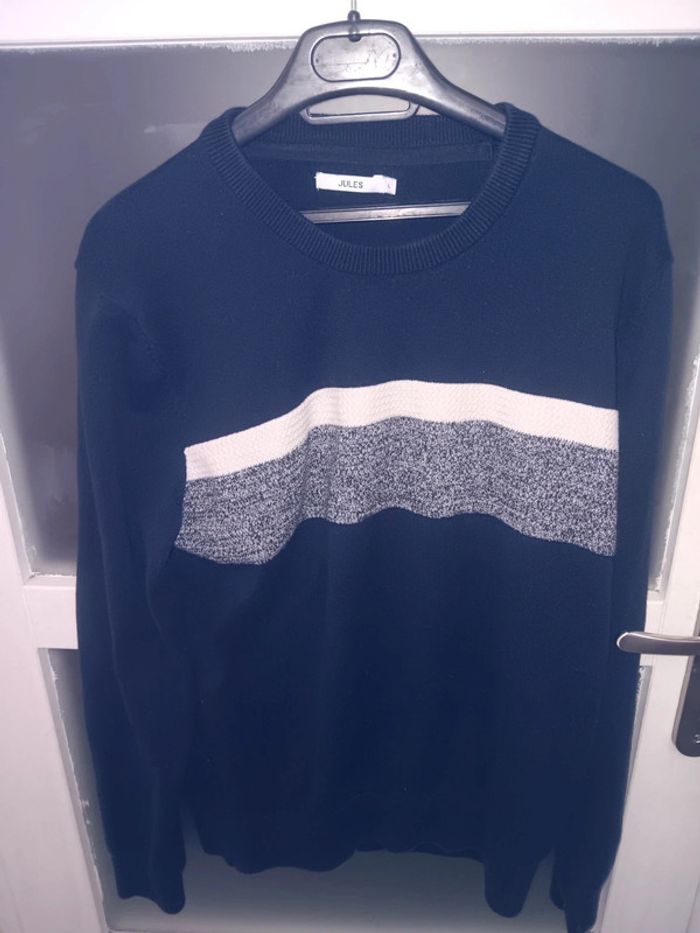 Pull-over homme de la marque Jules, couleur noire avec une bande blanche et grise sur la poitrine. Bon état général, coupe classique et col rond. Taille L