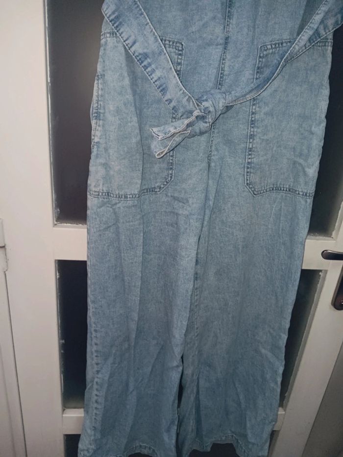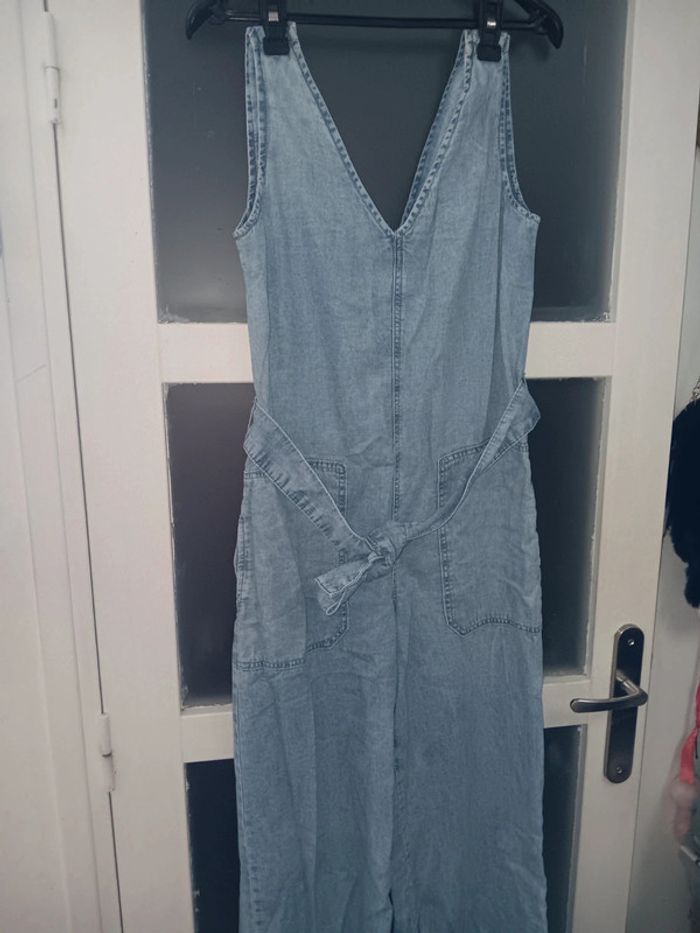 Combinaison en jean bleu clair, taille Xs, sans manches, décolleté en V, avec ceinture à nouer à la taille et grandes poches avant. Tres bon état, marque MNG. Longueur 135 cm Aisselle à aisselle 41 cm Tour de taille 40 cm