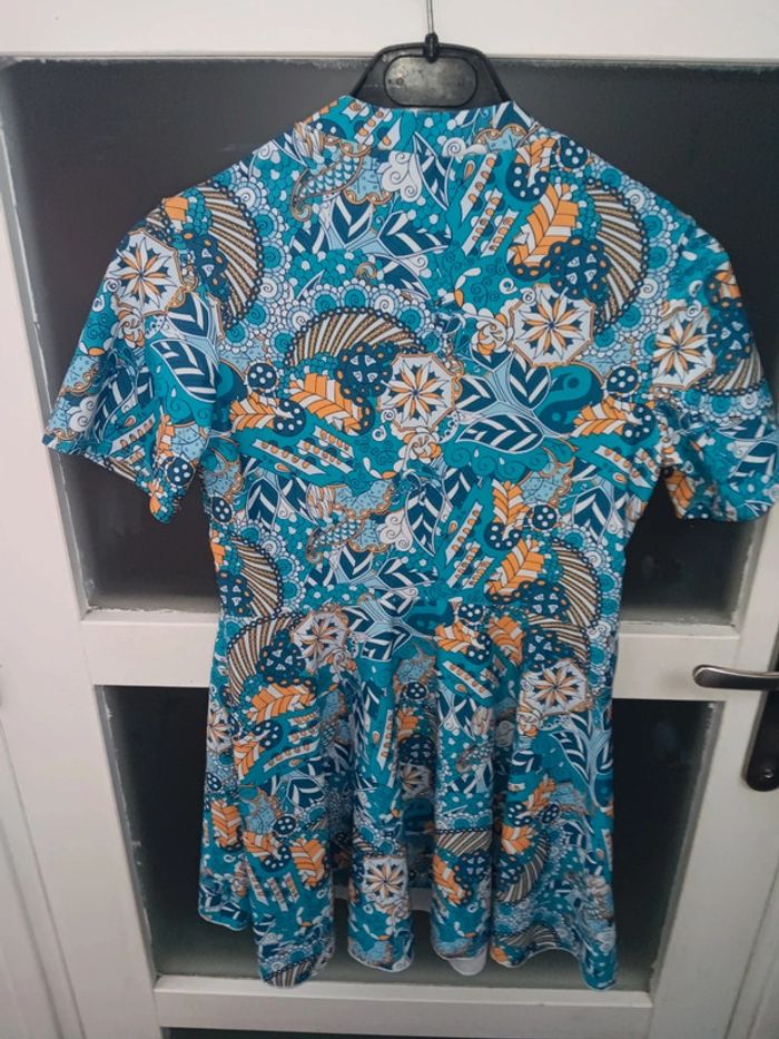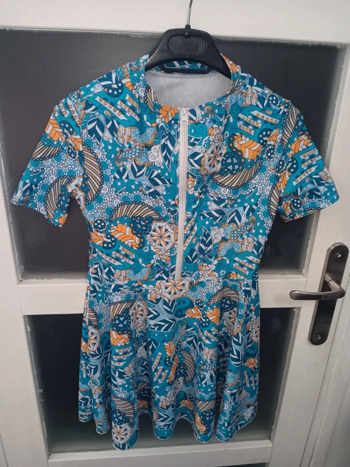 📣 Robe effet maillot de bain – Taille S Je vends cette robe super originale, taille S, avec un imprimé graphique coloré (bleu, orange, blanc). 📌 Matière : 82% polyester / 18% élasthanne – tissu extensible, lisse, type maillot de bain. Idéal pour la plage, les festivals ou un look décontracté et fun ! 🔹 Fermeture éclair sur le devant 🔹 Coupe légèrement évasée / patineuse 🔹 Très bon état –