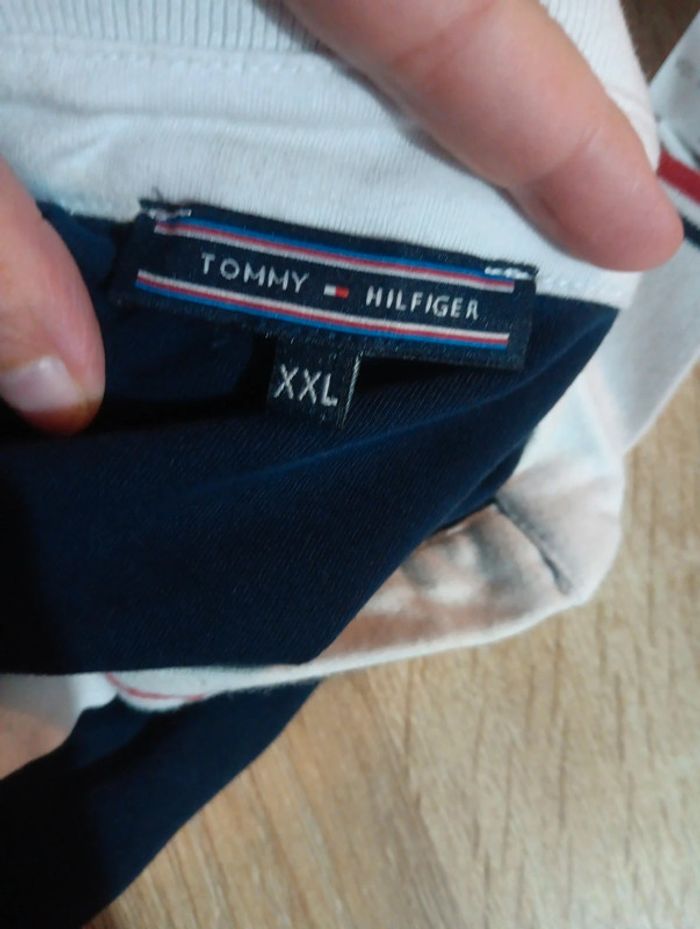 Robe polo Tommy Hilfiger bleue, col blanc, rayures rouges et blanches, logo brodé au dos, en très bonne etat, style décontracté et tendance. Taille M Noter xxl mais plus M