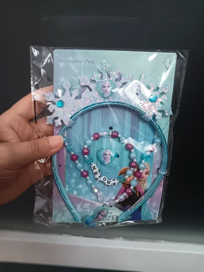 Set d’accessoires “La Reine des Neiges” neuf, comprenant un serre-tête couronne et un collier à perles décorés d’images des personnages Elsa et Anna,braceket et bague.