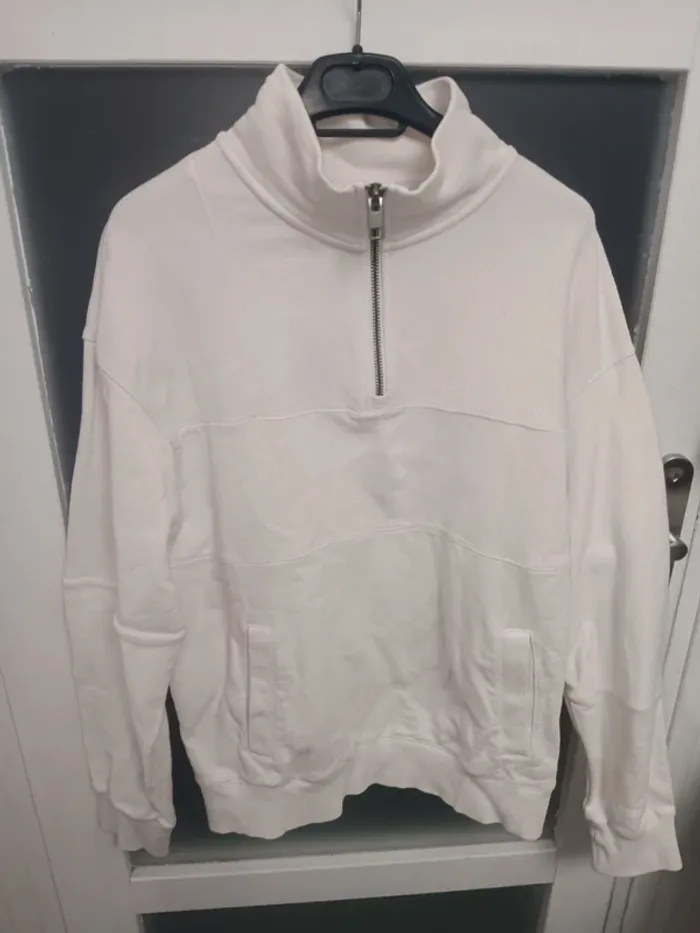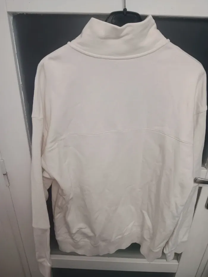 Sweat-shirt crème à col montant avec fermeture éclair, poches latérales, marque h&m, tissu épais idéal pour l’hiver, coupe ample et confortable. Taille m