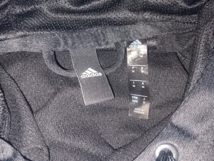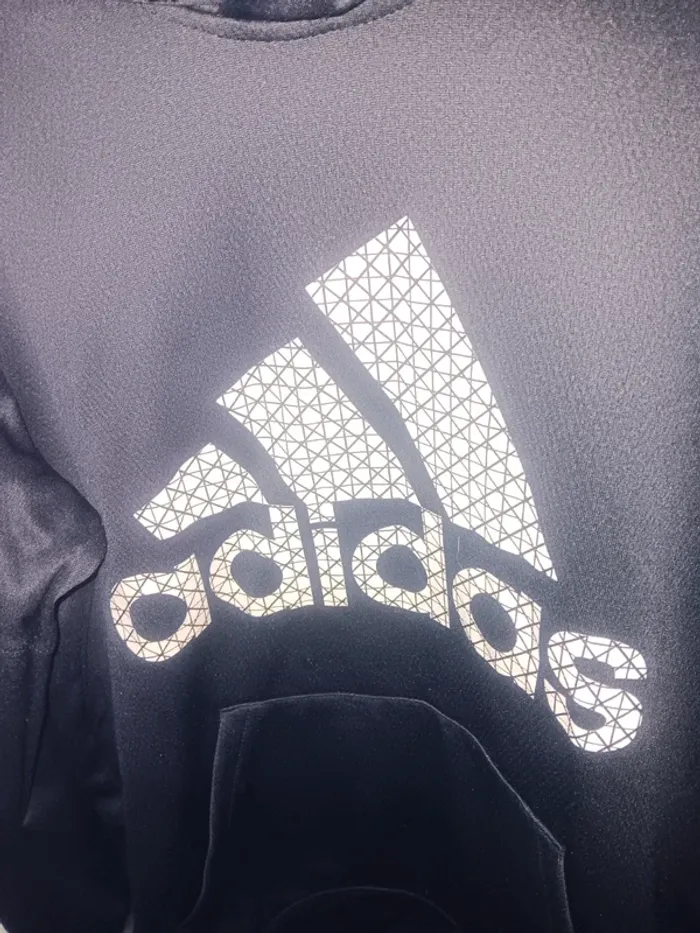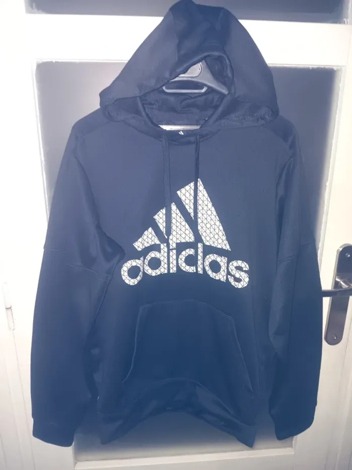 Sweat à capuche noir Adidas, logo blanc imprimé, poche kangourou, cordon de serrage, état tres bon, taille m.