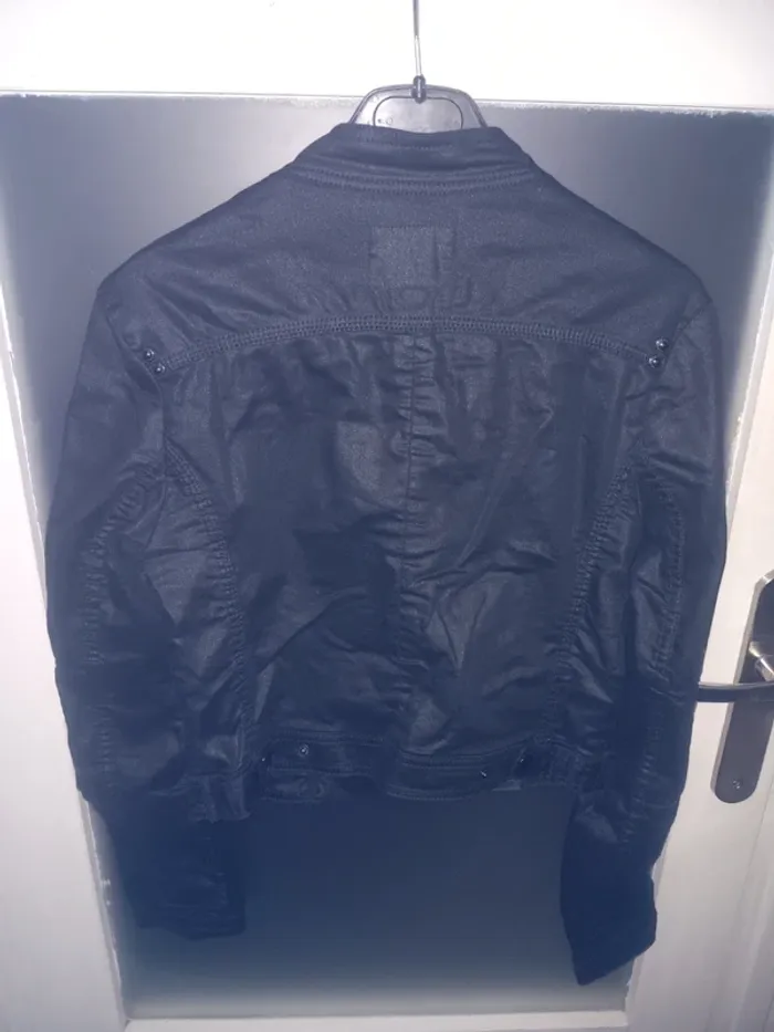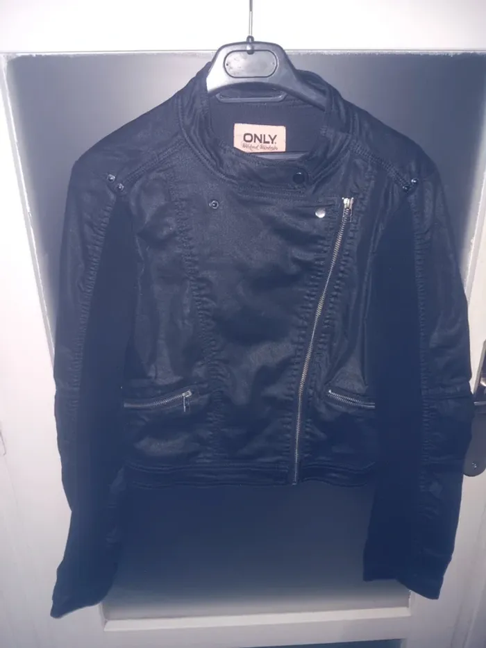 Veste noire de la marque ONLY, modèle biker genre faux cuir, fermeture éclair asymétrique, deux poches zippées, tres bon état général, style tendance et urbain. Taille 38