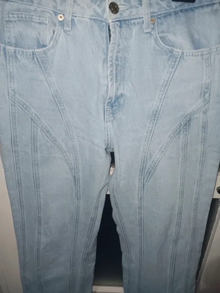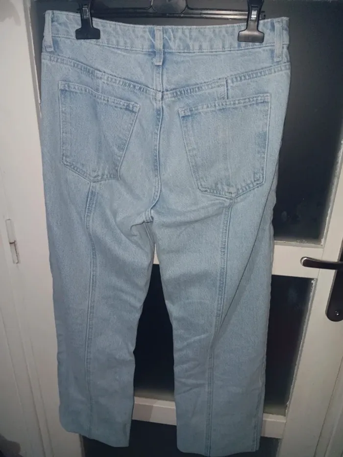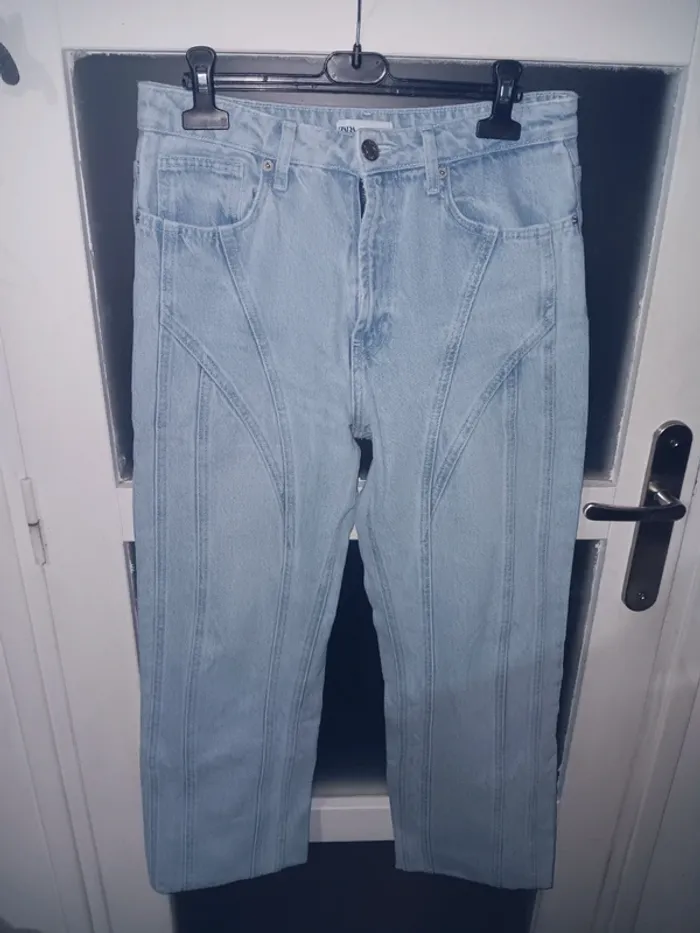 Jean en denim bleu clair, coupe droite, détails de couture avant distinctifs. État tres bon, marque Zara, modèle moderne et tendance. Taille 38