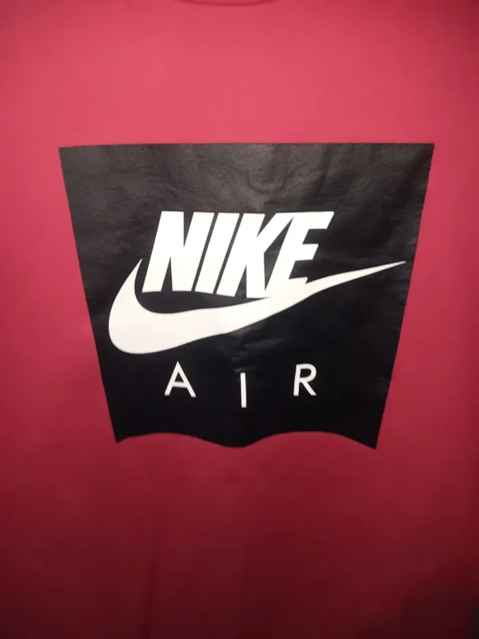 Sweat-shirt Nike Air rouge, logo central noir et blanc, manches à bandes blanches et noires, style sport moderne, taille S.