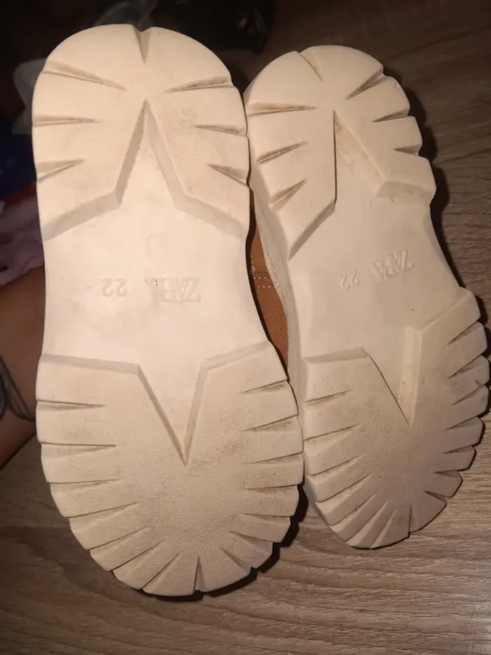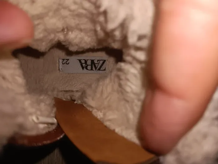 Paire de bottines pour enfant en daim marron, doublure fourrée blanche, semelles épaisses crantées, état d’occasion, marque Zara, adaptées pour l’hiver. Abîmé un peu devant mais rieb de méchant Taille 22