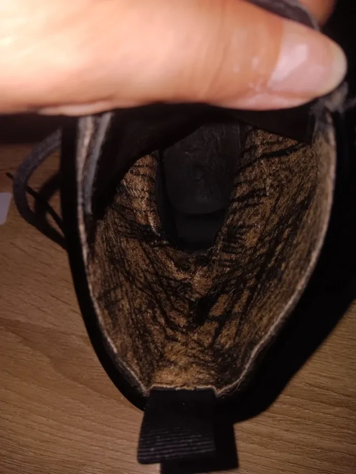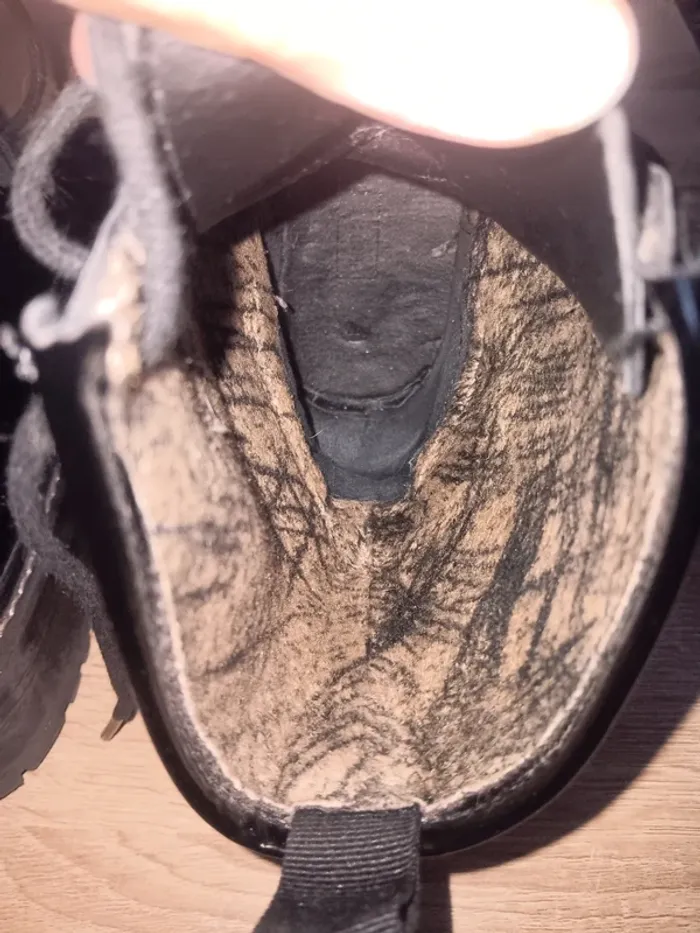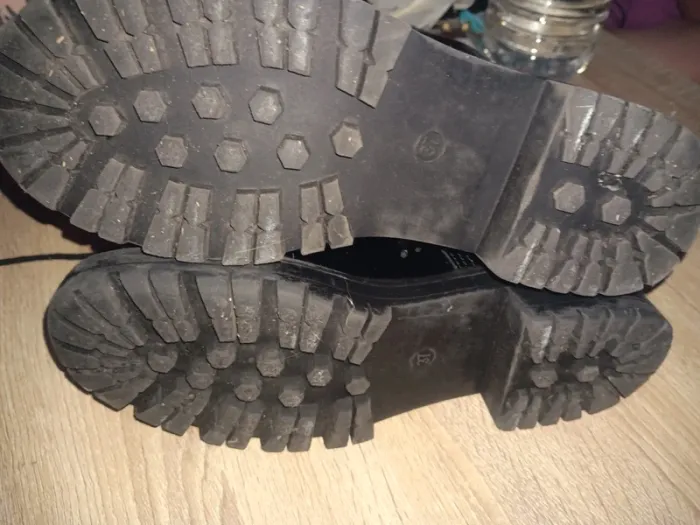 Bottines montantes noires vernies, semelles épaisses crantées, en bon état général, lacets noirs, style moderne et tendance, marque Merry Scott, taille 37. Abîmé a 2 endroit chaussure droite voir les 2 derniere photo mais ça ne gêne en rien Sur le vernis on voit des traces d usure