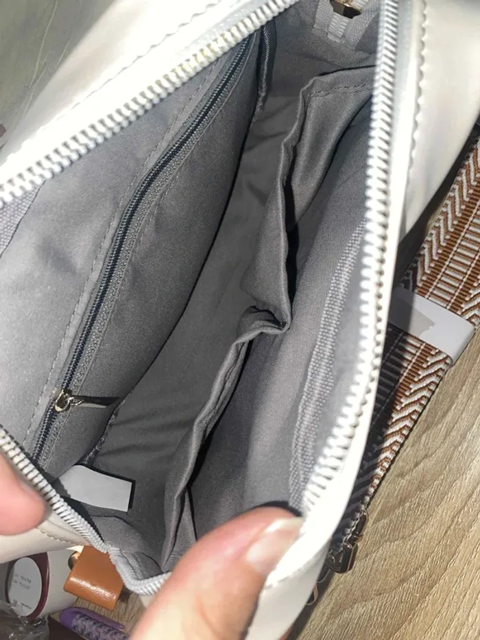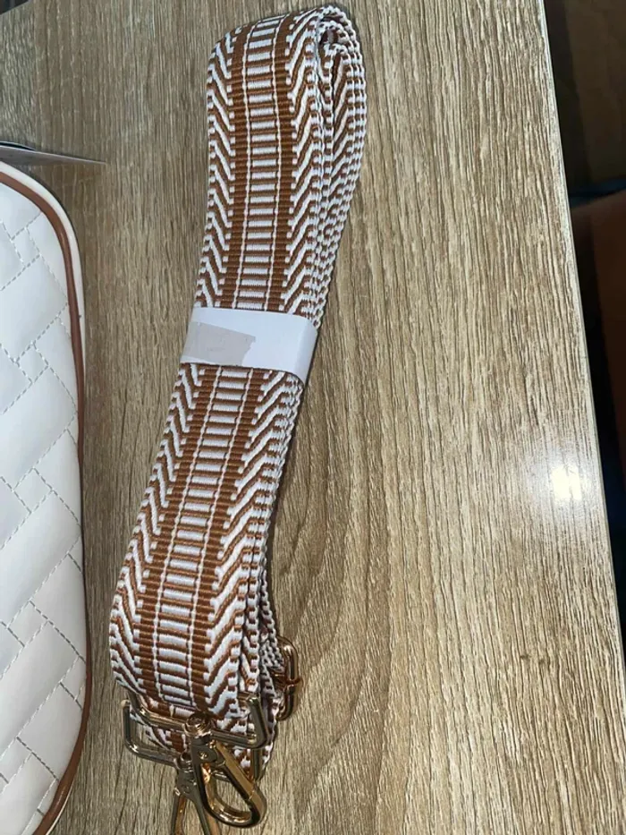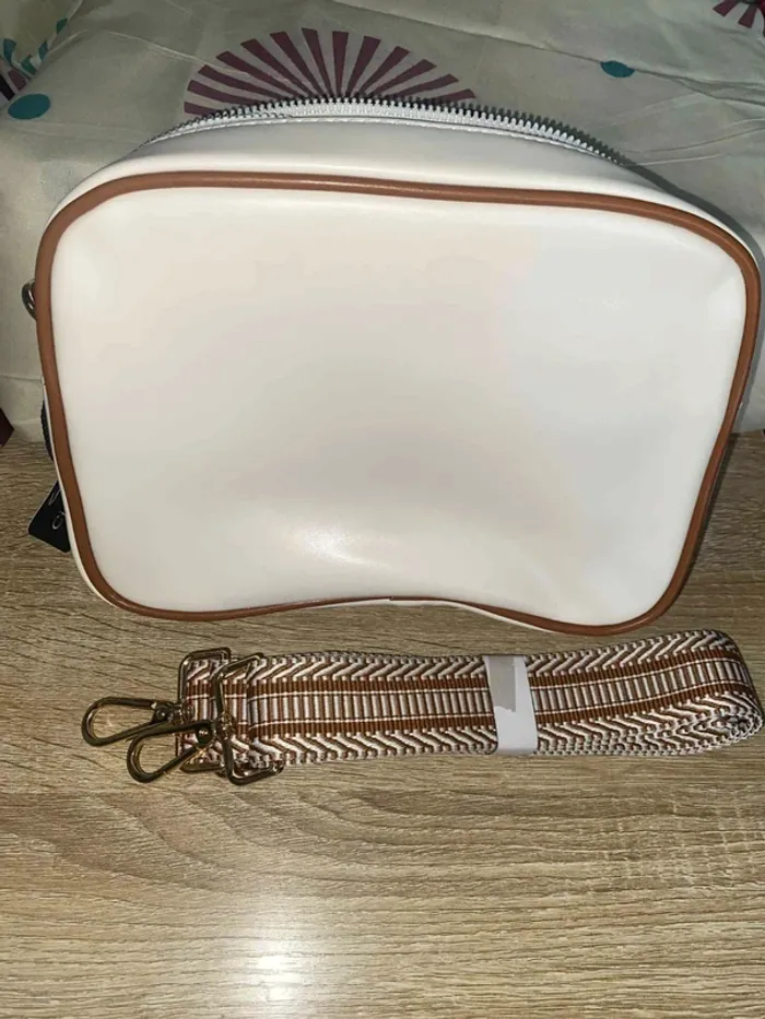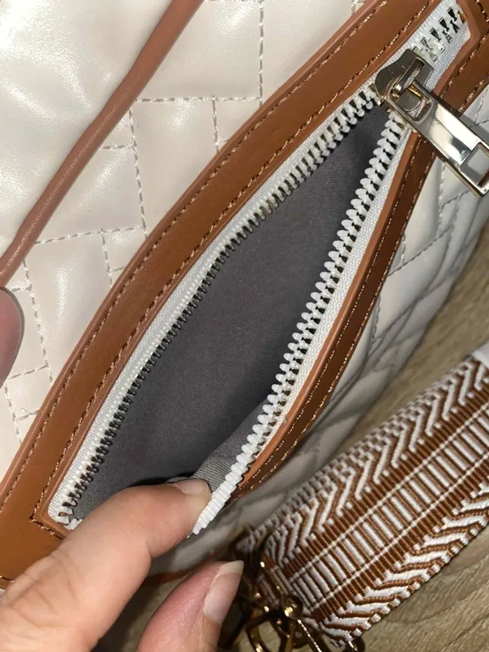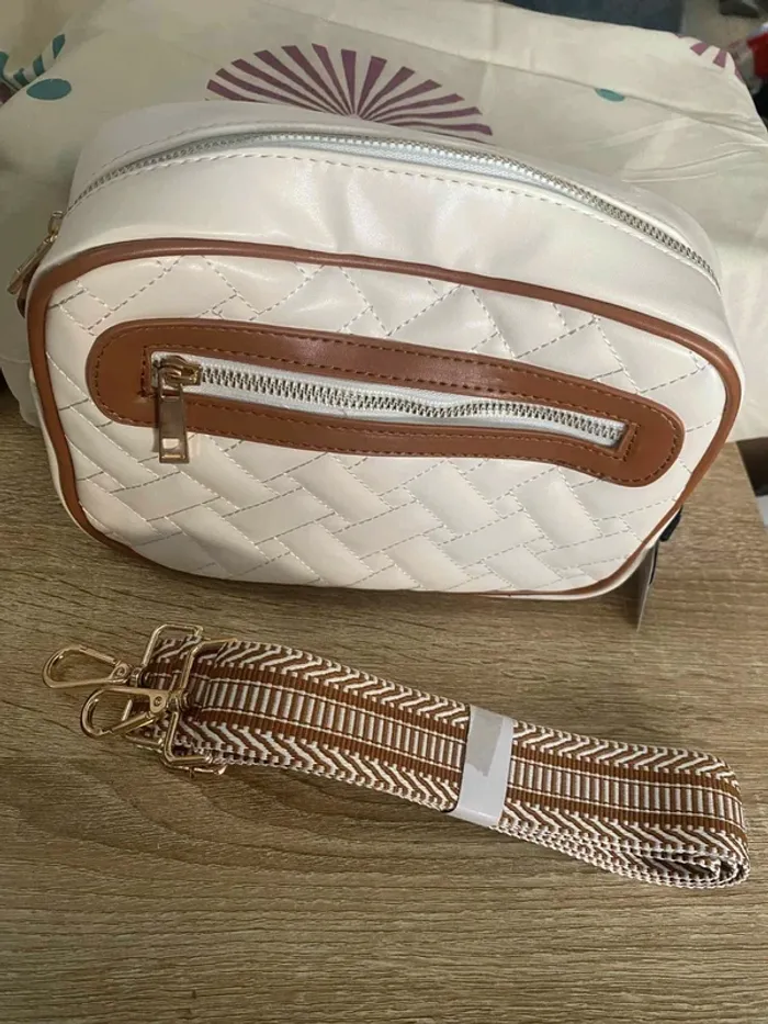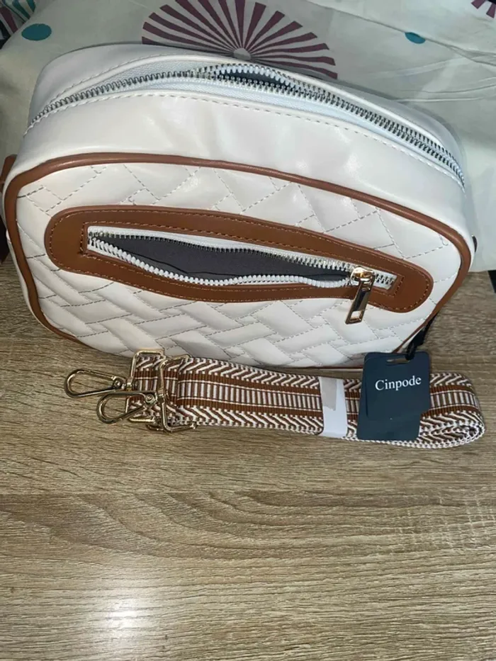 Sac bandoulière Cinpode, blanc matelassé avec bordures marron, poche zippée devant, bandoulière tressée détachable, état neuf, design moderne et élégant.