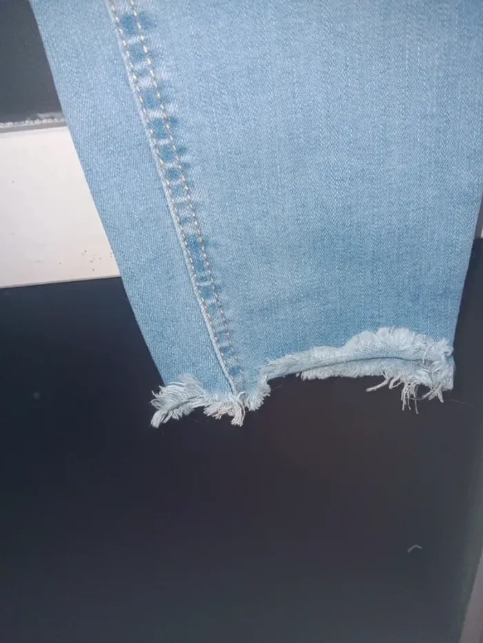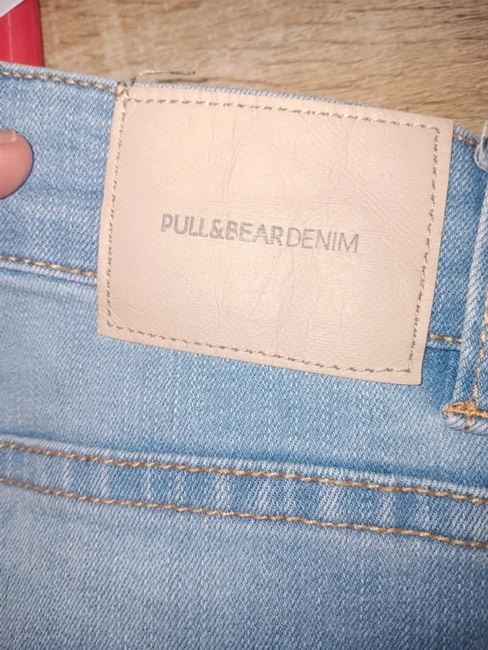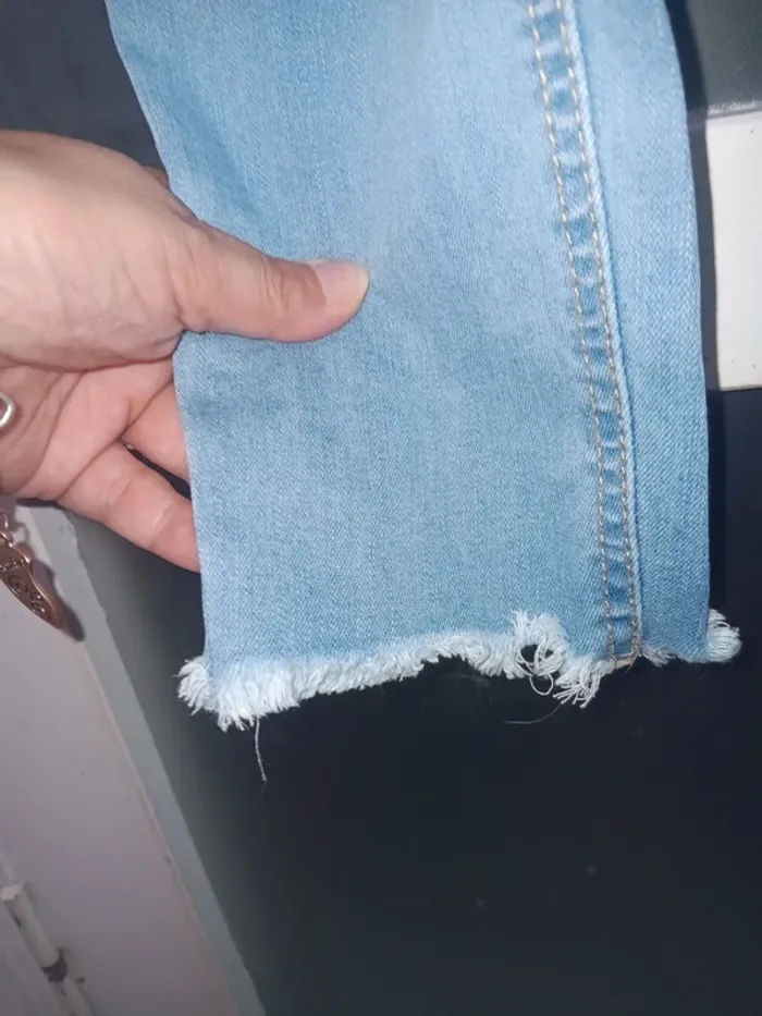 Jean bleu clair Pull&Bear, modèle délavé avec effet usé, trou décoratif sur la jambe droite, coupe slim, ourlets effilochés, en tres bon état général. Taille 38