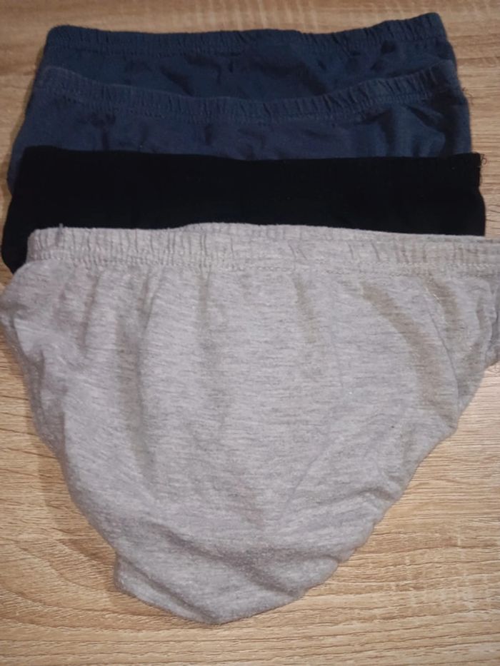 Lot de trois slips en coton, couleurs gris, noir et bleu. Tres bon état général, marque Tissaia, élastique apparent, coupe classique. 10/12 ans