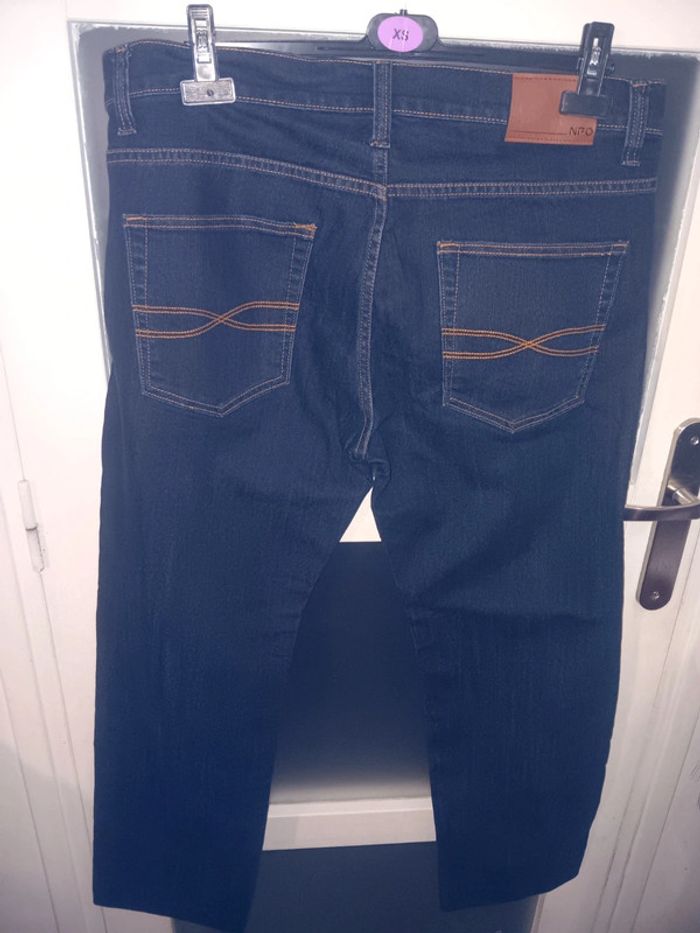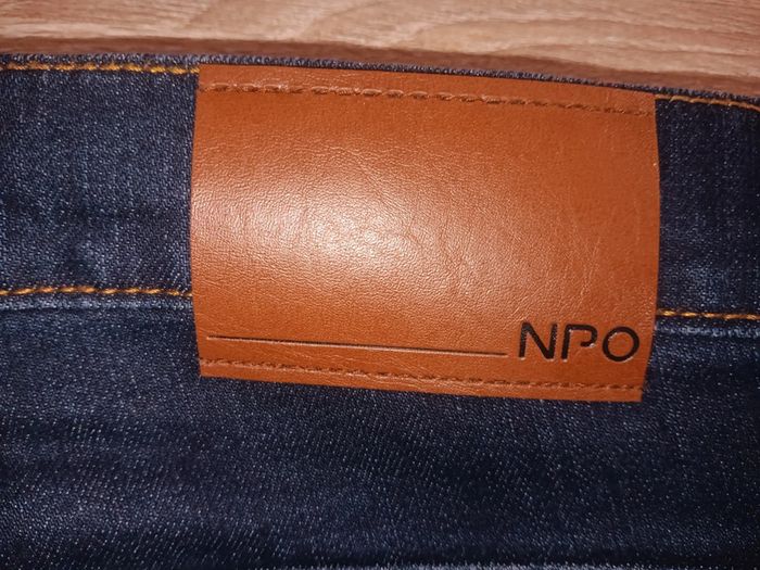 Jean bleu foncé de la marque NPO, taille 48, en très bon état. Poches arrière brodées, surpiqûres orange, coupe classique, aucun défaut visible. Tour de taille 47 cm Entre jambe 73 cm Longueur 103 cm