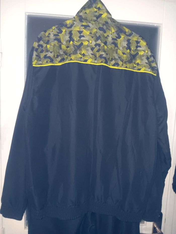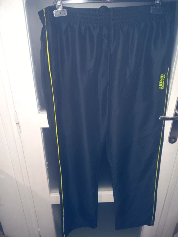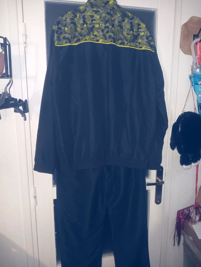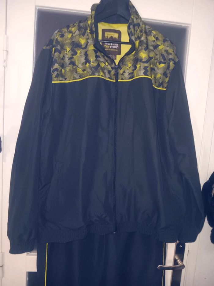Ensemble de survêtement noir avec motifs jaunes et verts sur les épaules, en tres bon état, fermeture éclair, bandes latérales jaunes, style sportif moderne. Marque Atlas for men Taille XL Veste épaule à épaule 53 cm Aisselle à aisselle 65cm Longueur 81 cm Pantalon Tour de taille 44 cm Longueur 108,5 cm Entrejambe 80 cm