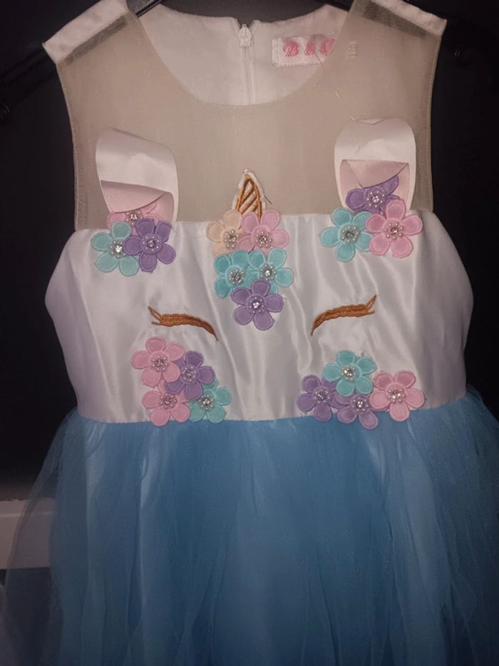 Robe de fille, motif licorne, haut blanc orné de fleurs colorées, jupe bleue en tulle, en très bon état, idéale pour occasions spéciales ou déguisements. 6 ans