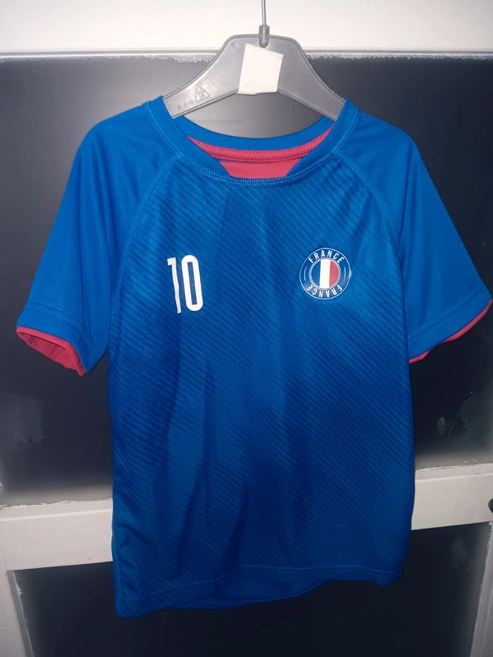 Maillot de foot bleu, numéro 10, écusson "France", en bon état, manches courtes, détails rouges, sans marque apparente, convient aux fans de football. 6/8 ans