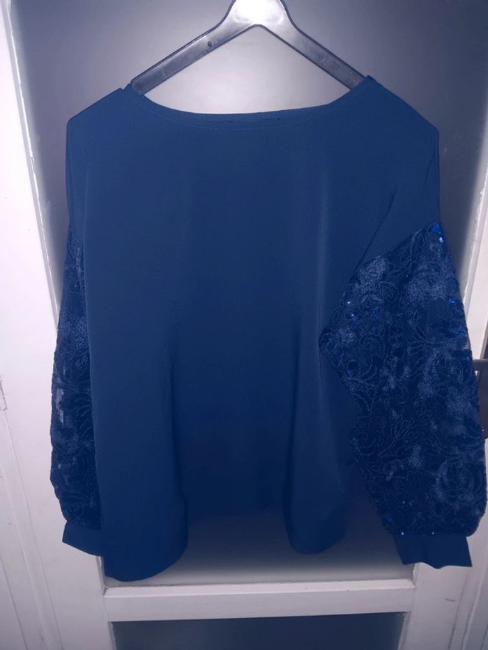Pull bleu foncé, manches longues en tissu décoré brillant, tres bon état général, coupe ample et moderne, idéal pour un look élégant et décontracté. Taille 40/42