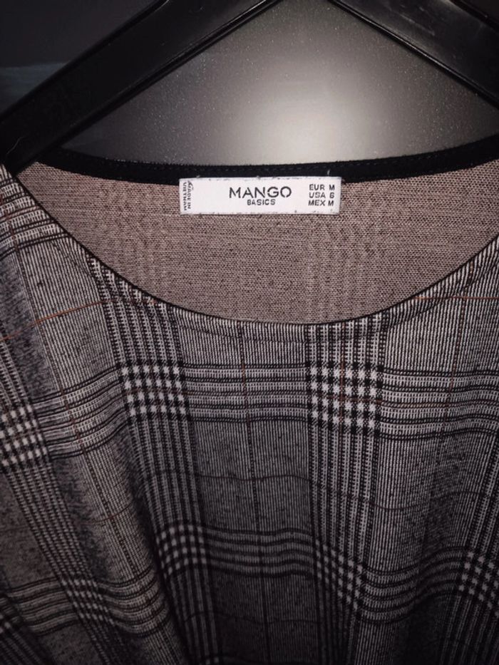 Robe à carreaux gris style prince-de-galles, manches longues, marque Mango, nœud à la taille, tissu léger, coupe élégante et moderne. Taille m