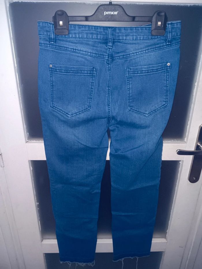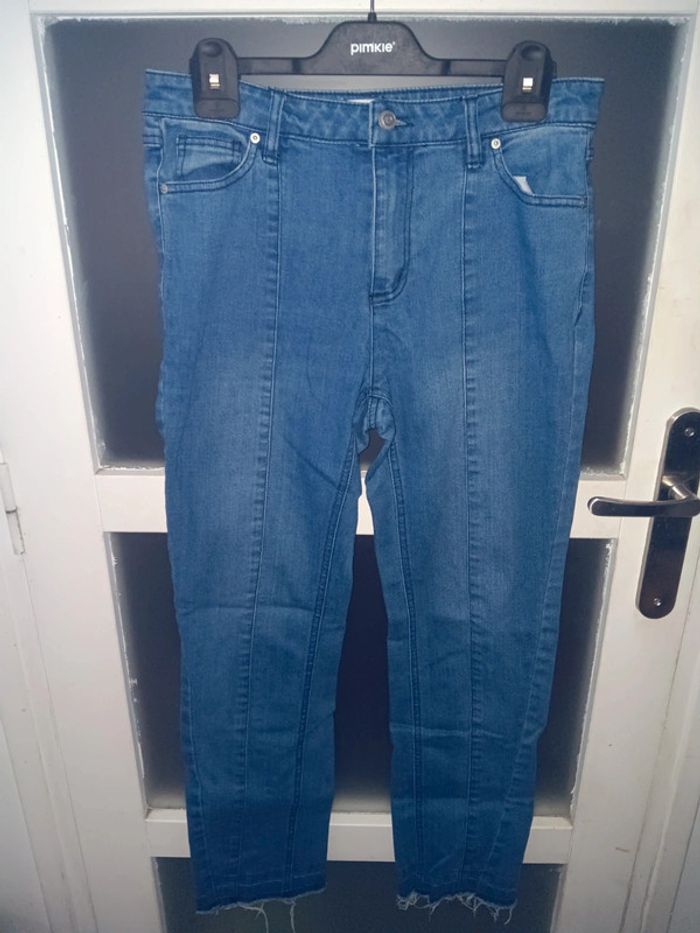 Jean bleu en denim, modèle simple sans marques visibles, taille standard, état correct, bas effiloché, cinq poches, fermeture boutonnée, convient pour un usage quotidien.