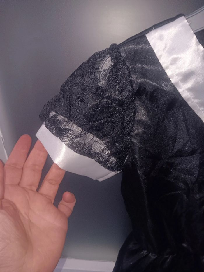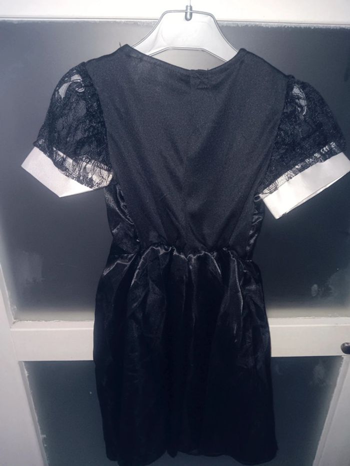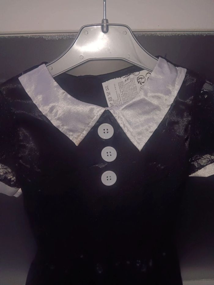 Deguisement de Mercredi, robe noire à col blanc et boutons, manches courtes avec bordures blanches, état neuf avec étiquette, taille 4/6 ans