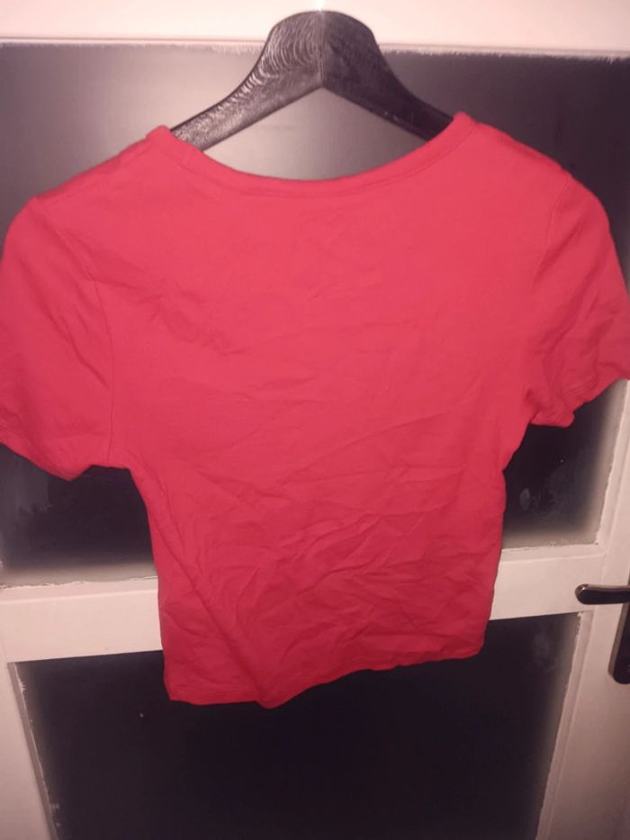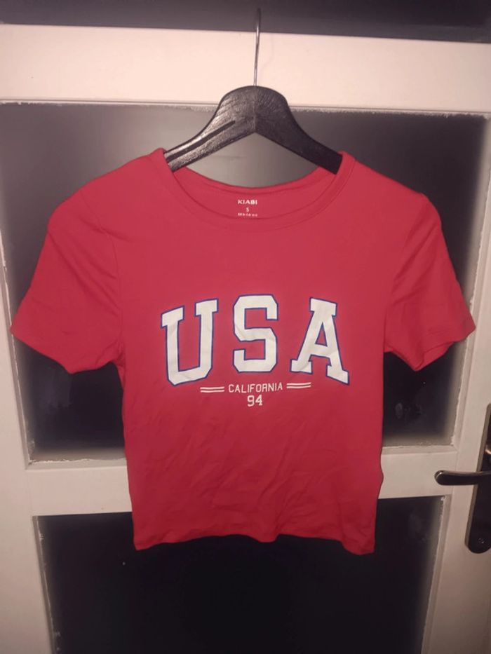 T-shirt rouge Klash, inscription "USA CALIFORNIA 94" en blanc et bleu, manches courtes, état neuf, coupe courte tendance et en tres bon état général. Taille S