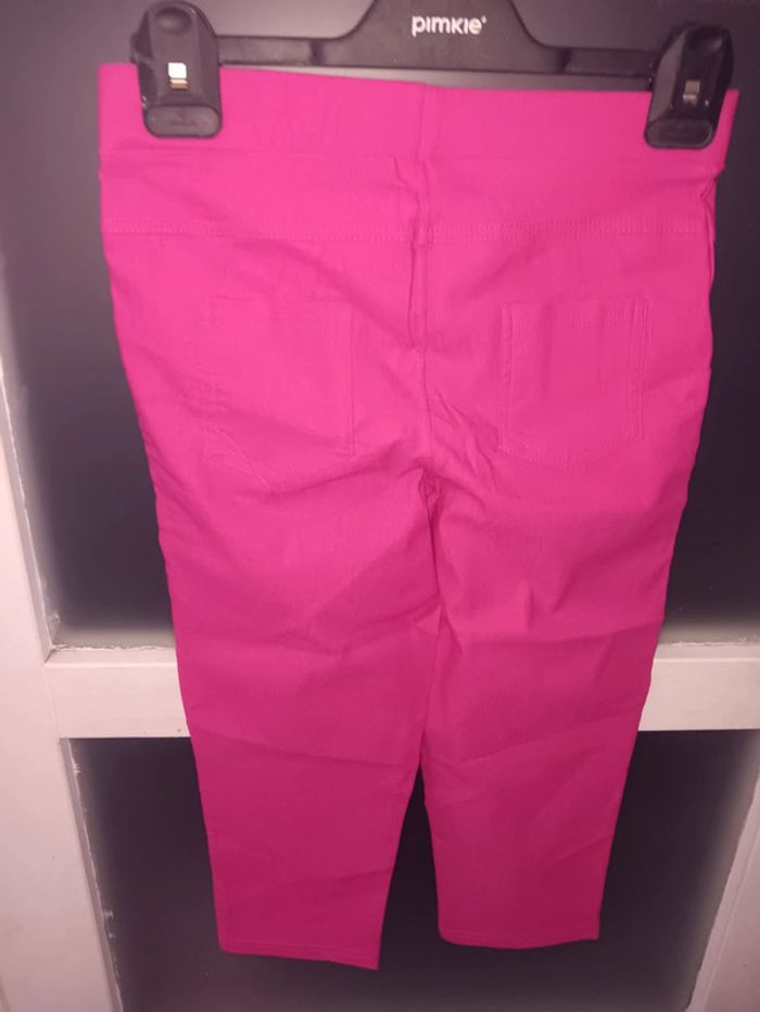 Pantacourt rose pour femme, neuf avec étiquette, détail rayé noir et blanc sur les poches avant, tissu stretch, coupe slim. Taille xs/s Plus petit que ce qui est marqué sur l etiquette Arrive juste après les genoux Tour de taille 32,5