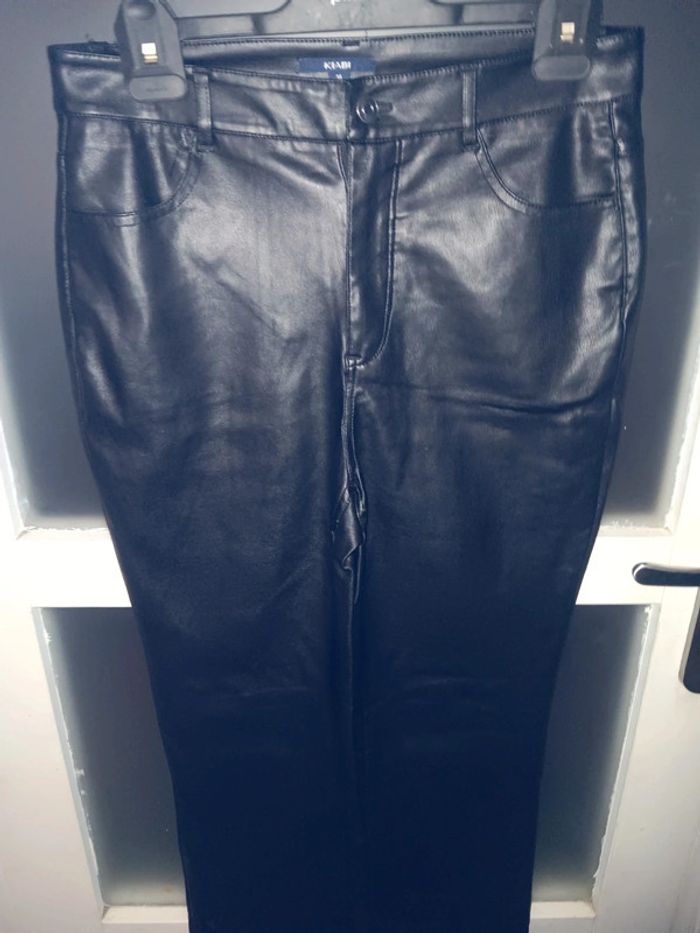 Pantalon noir genre faux cuir, marque kiabi, coupe droite, sans défauts visibles, idéal pour un style tendance et moderne. Taille 38