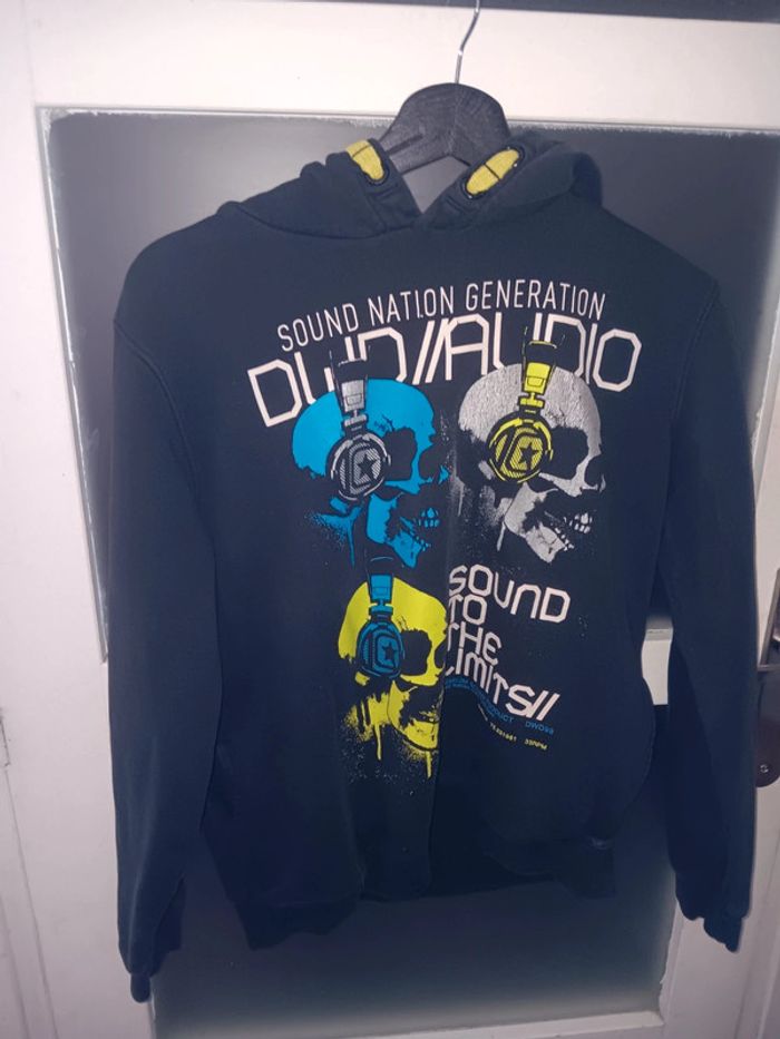Sweat à capuche noir, imprimé de trois crânes colorés avec casques audio. Inscription « SOUND NATION GENERATION », tres bon état, style urbain, taille 13/14 ans