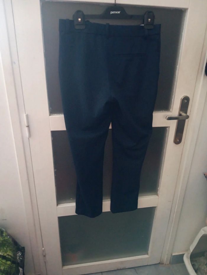 Pantalon bleu marine pour femme, marque h&m, en très bon état, coupe droite classique, tissu lisse, idéal pour un look professionnel ou décontracté.