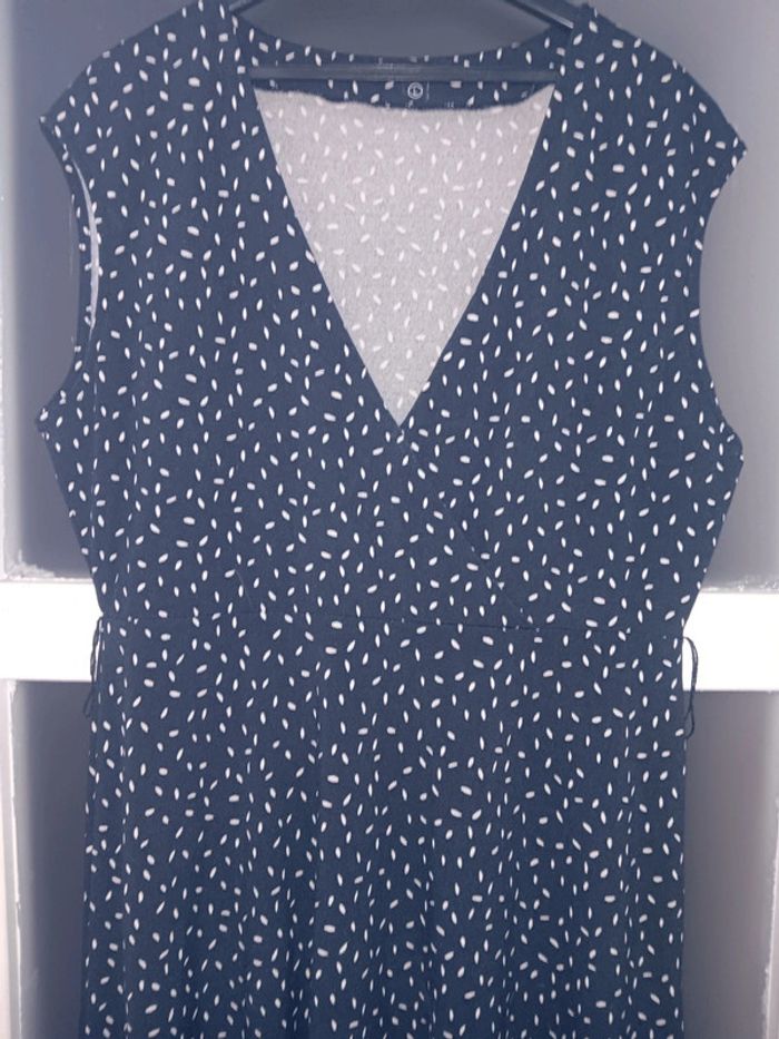 Robe noire avec des motifs blancs, sans manches et décolleté en V. en tres bon état, sans traces d'usure apparentes. Taille L