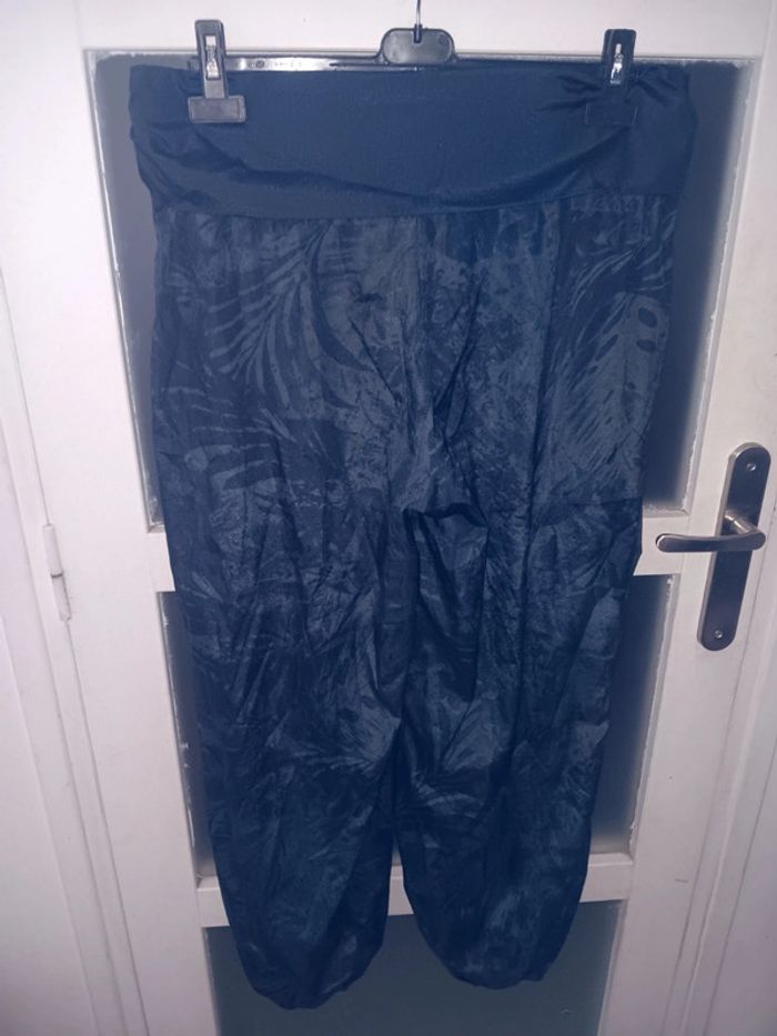 Pantalon ample de couleur bleu foncé et vert avec un motif discret. Très bon état Taille 4xl mais taille plus petit plus taille 44/46 idéal pour une tenue décontractée. 90% polyester 10% spandex Tour de taille 48cm