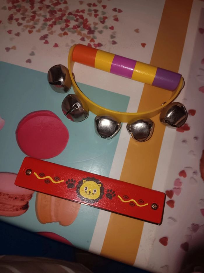 Lot de deux instruments en bois et plastique pour enfants comprenant un hochet avec clochettes et un harmonica illustré d'un motif lion.