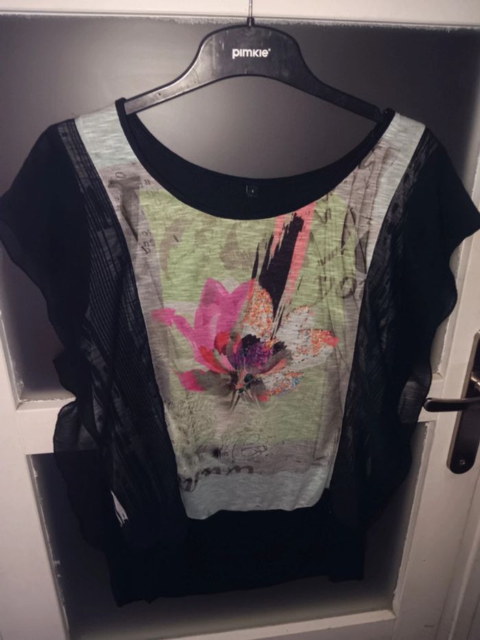 T-shirt légère avec imprimé floral coloré, manches larges en tissu transparent noir Taille L