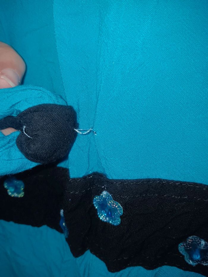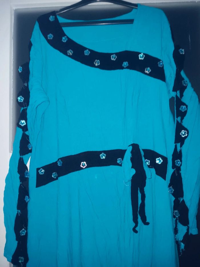 Robe longue taille m de couleur bleue avec des ornements scintillants sur le col et les manches. en tres bon état général, juste au niveau du noeud le fil sera à reparer