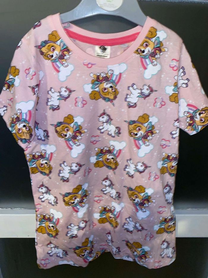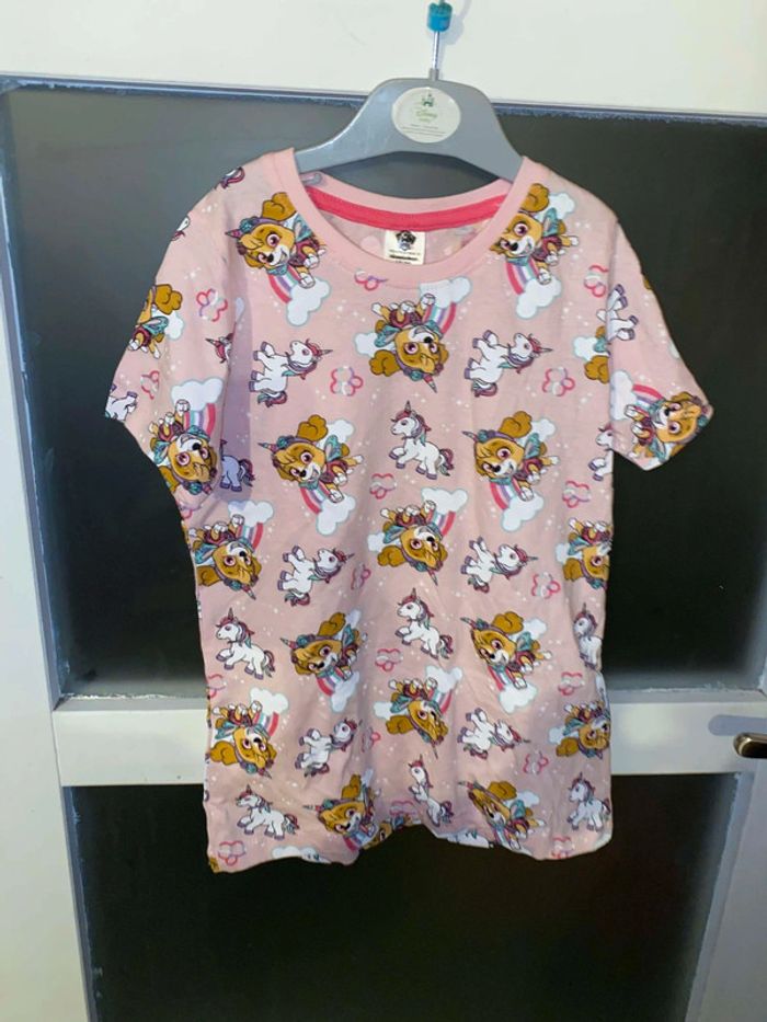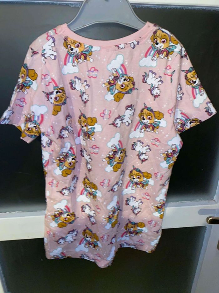 T-shirt neuf sans étiquette, taille 7/8 ans (122 cm), avec motif Pat' Patrouille sur fond rose. En coton