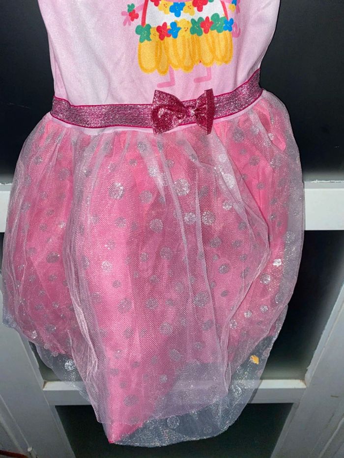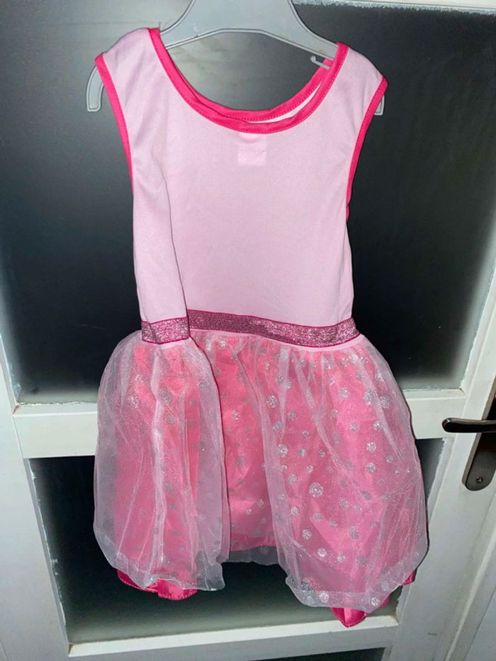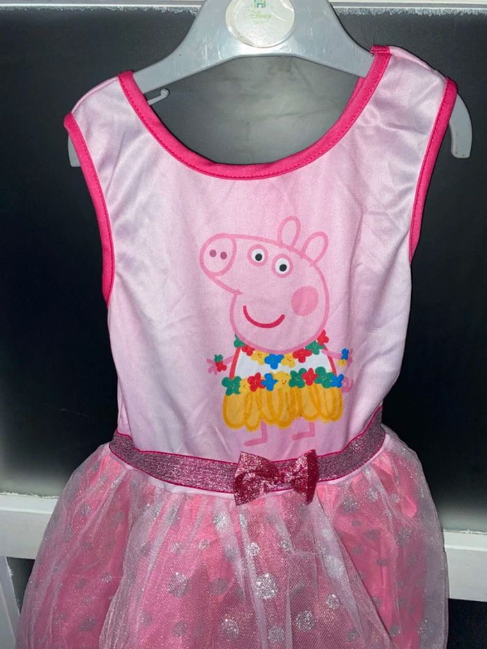 Robe de couleur rose avec une impression Peppa Pig sur le haut. Dotée d'une jupe en tulle étincelant avec un ruban. Neuve sans etiquette