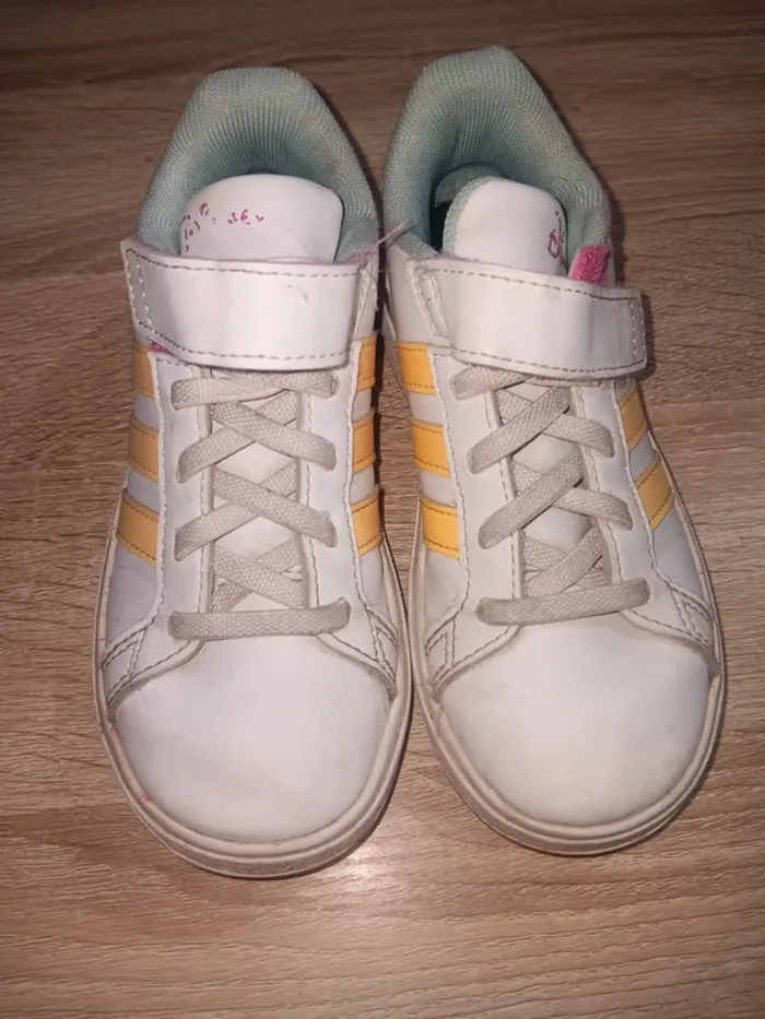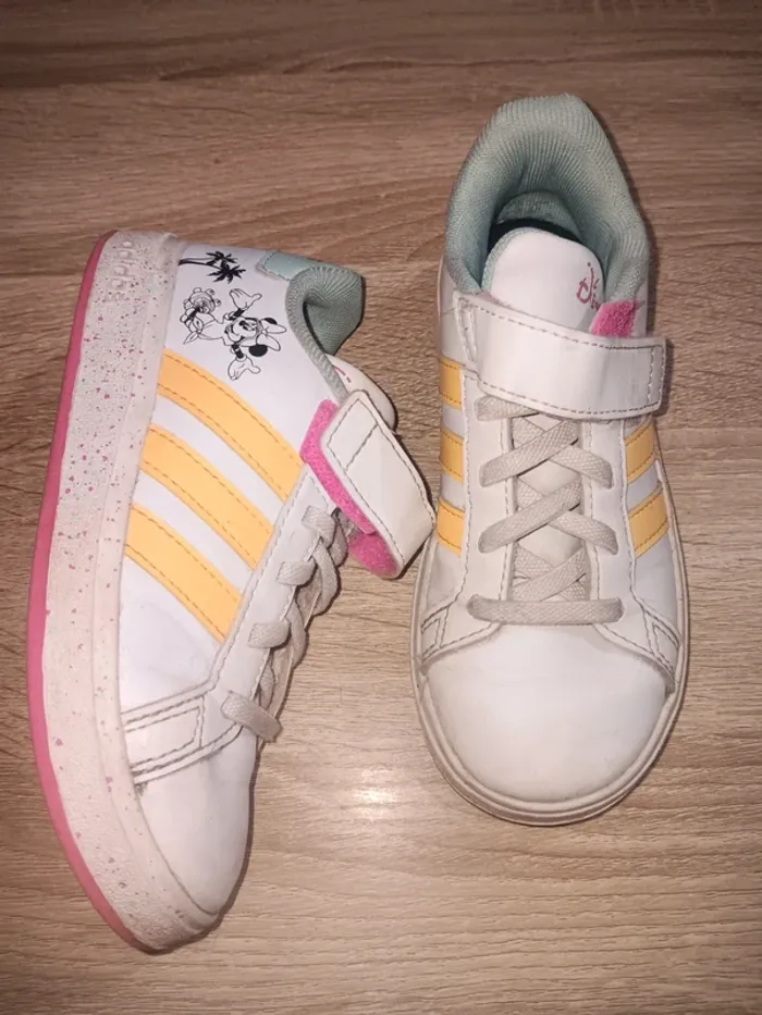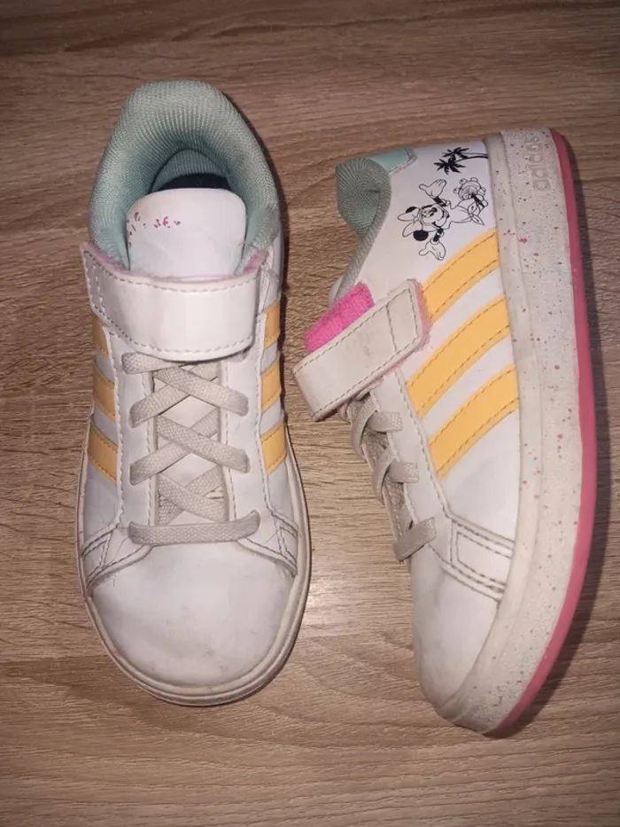 baskets Adidas enfants, blanches à bandes jaunes, scratch rose, dessins de Mickey, semelles roses, état usagé avec traces visibles, modèle original et ludique. Taille 29 sur une languette le Disney s'est effacé