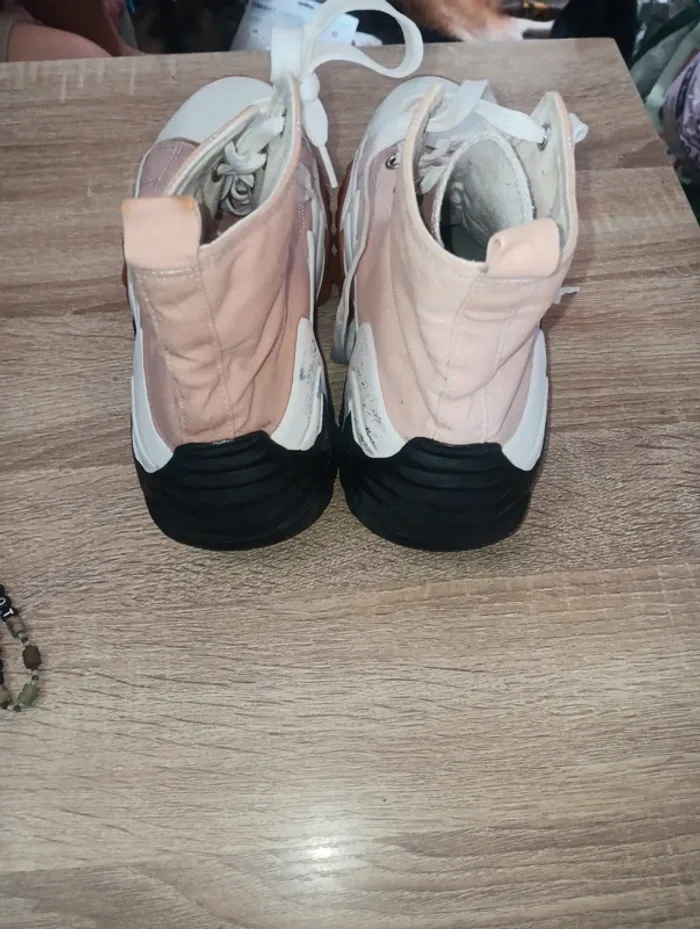 Basket montantes de couleur rose et blanche, semelles épaisses crantées marron/noir, état tres bon, juste des traces sur les semelles blanches boir photo mais ne gene en rien, design moderne, lacets blancs. Taille.39