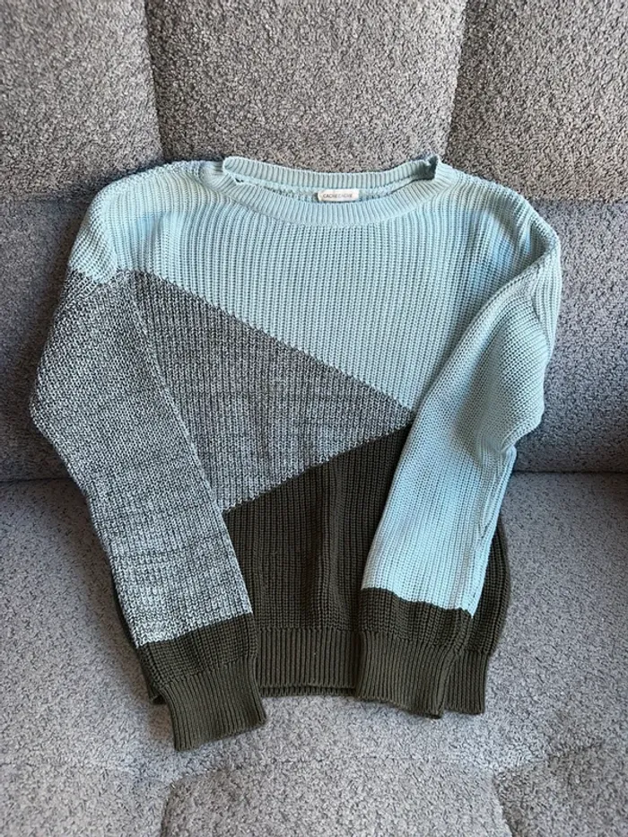 Joli pull chaud d’hiver en maille tricolore turquoise kaki de chez Cache Cache. Taille S. Excellent état, porté seulement une fois. Maison non fumeur et sans animaux.