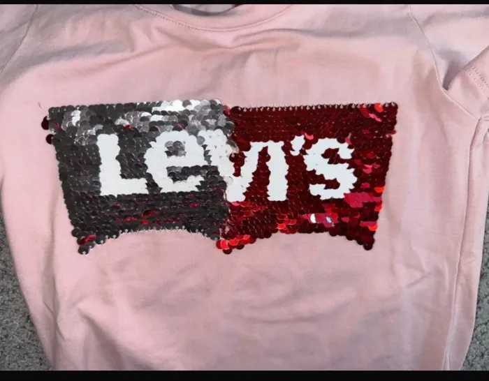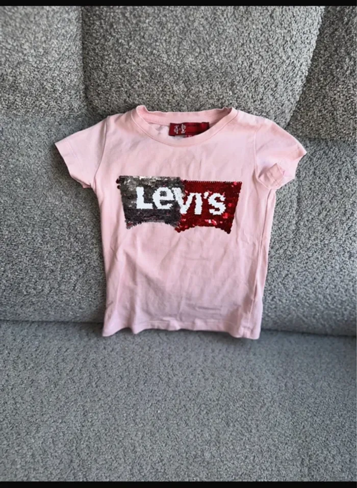 T-shirt à sequins réversibles couleur rose de chez Levi's. Peu porté très bon état. Taille 92cm. Maison non fumeur et sans animaux.