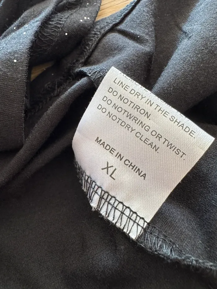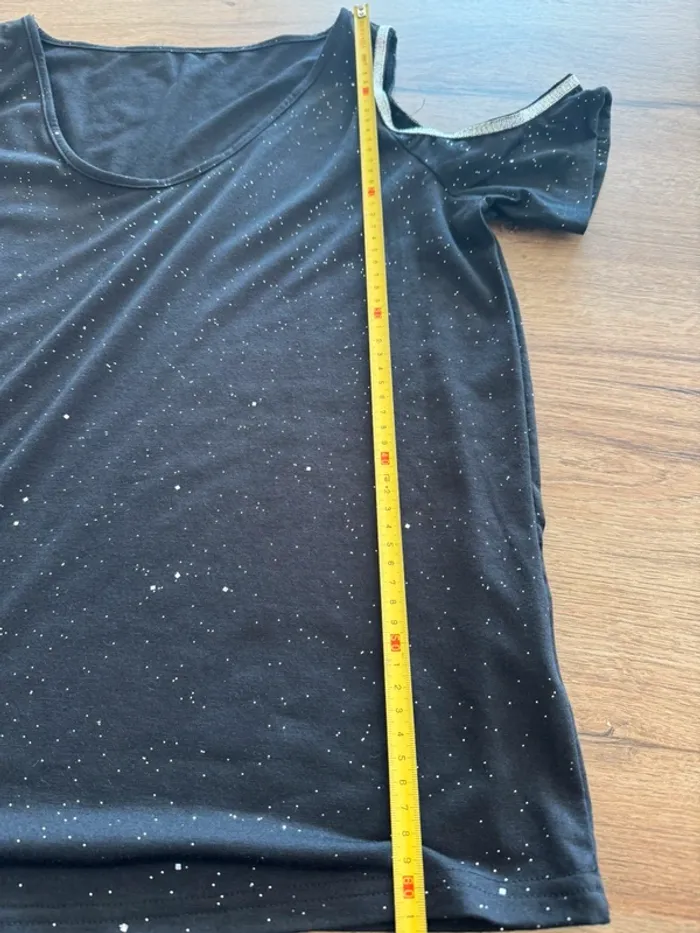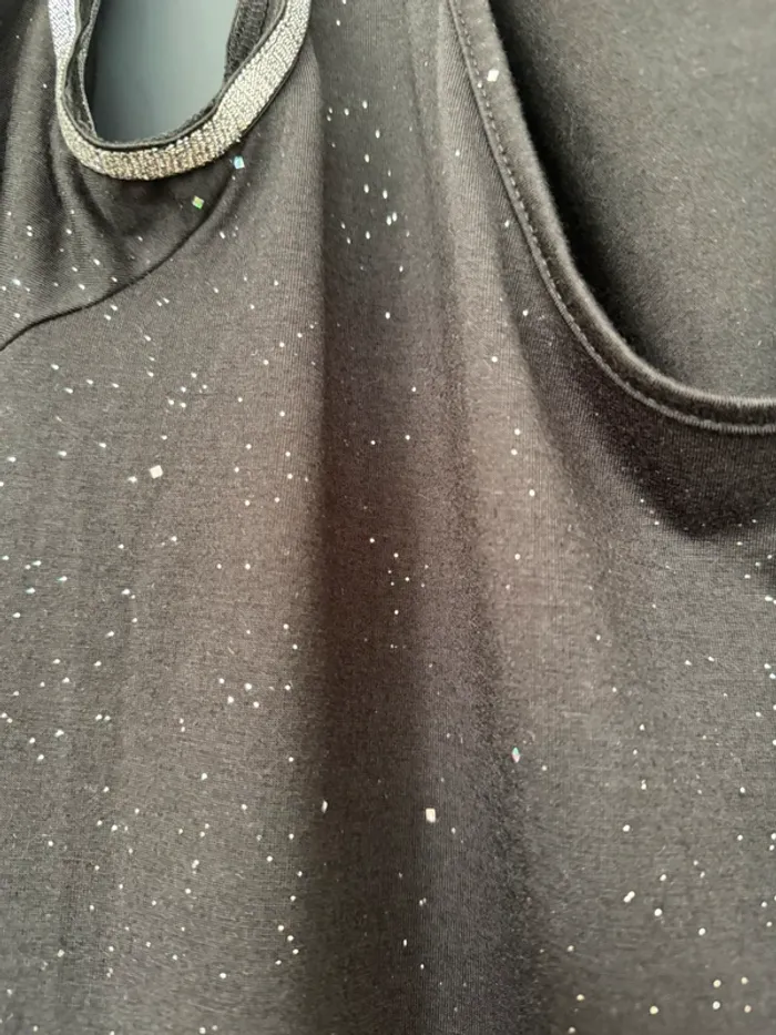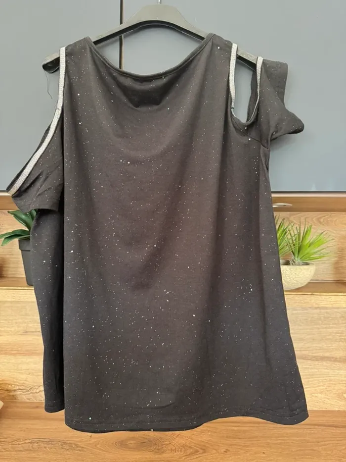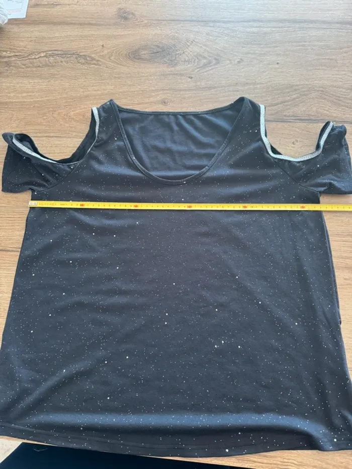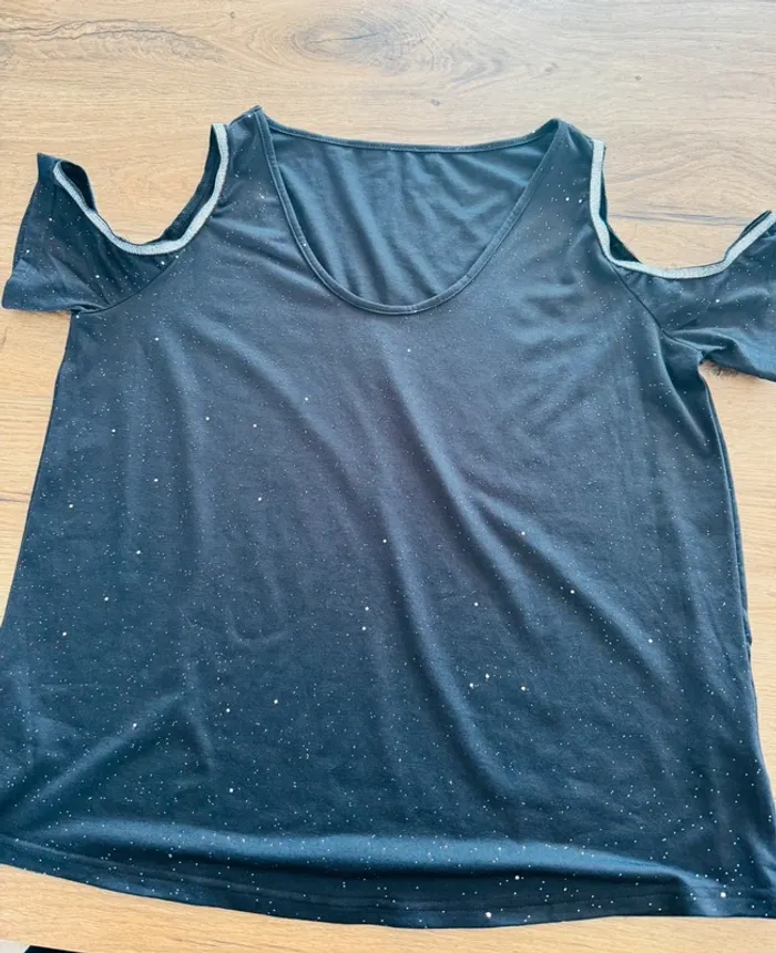 Teeshirt pailleté noir argent ouvert sur le haut des épaules. Taille XL, voir photos avec les mesures Je ne connais pas la marque.