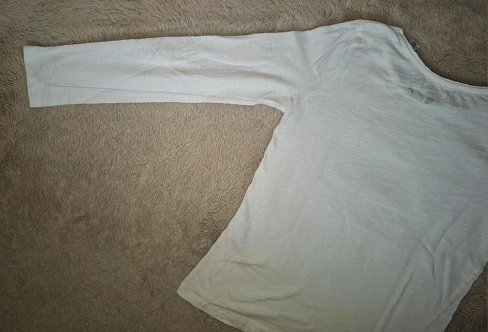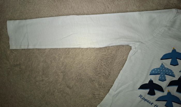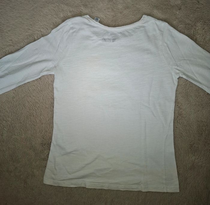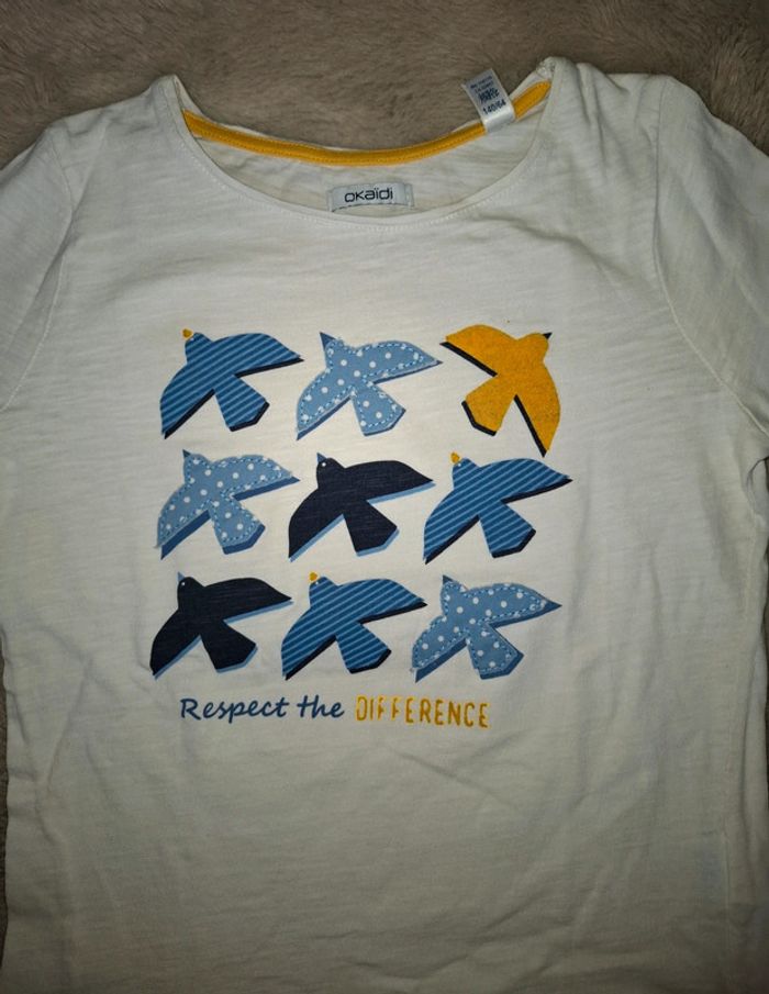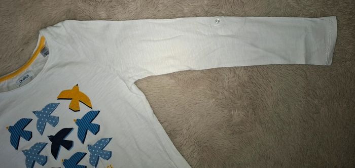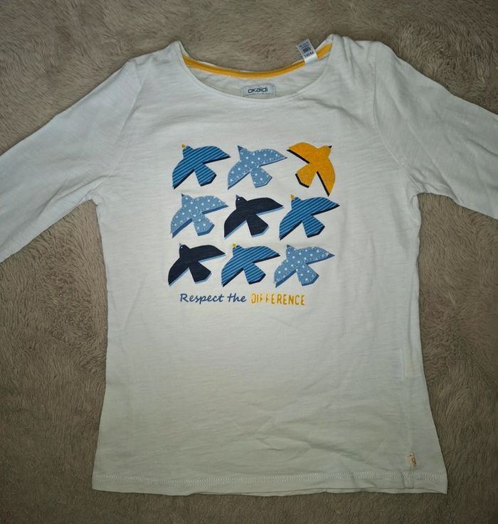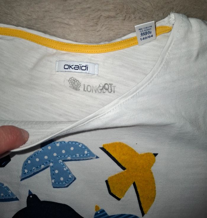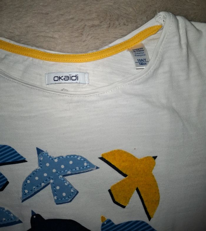 T shirt manche longue Okaidi Blanc avec oiseaux jaune et bleu ligné ou à pois 10 ans 140 cm Très bon état (le nom de ma fille est noté à l interieur) Envoi rapide et soigné #ange1911fille10ans