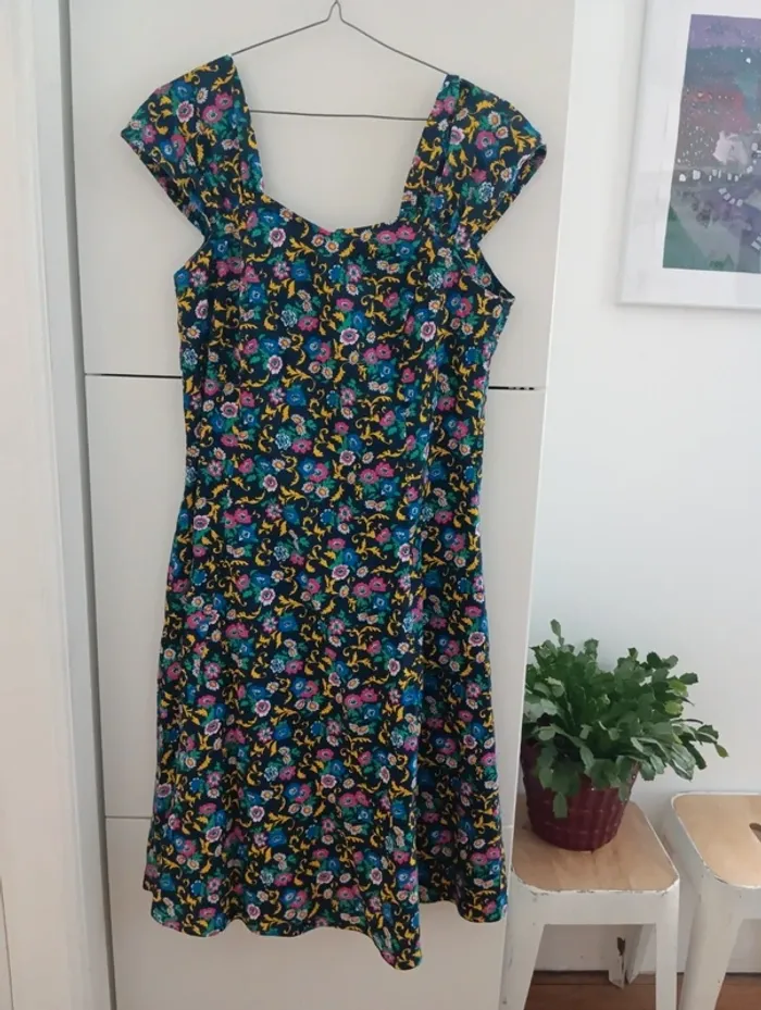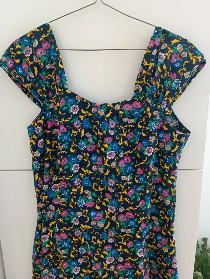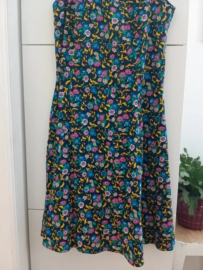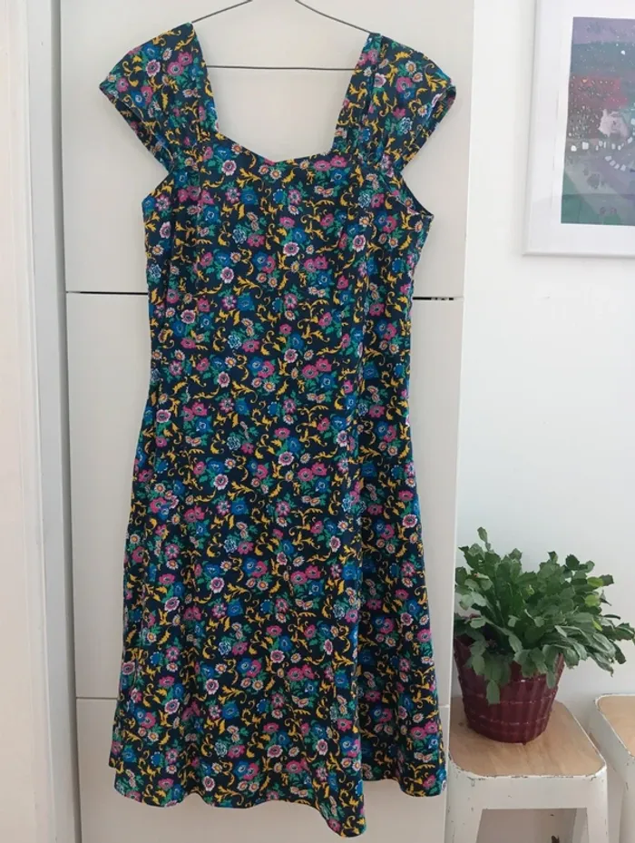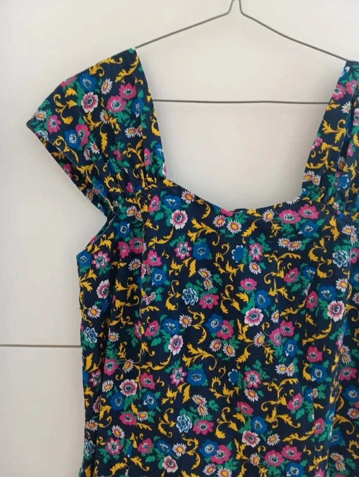 Robe vintage fleurie en coton Coton marine, fleurs multicolores. Fermeture au dos Larges bretelles. Taille 42/44 estimée à confirmer avec les mesures Mesures Épaules Aisselles 49cm Taille 45cm Longueur 112cm