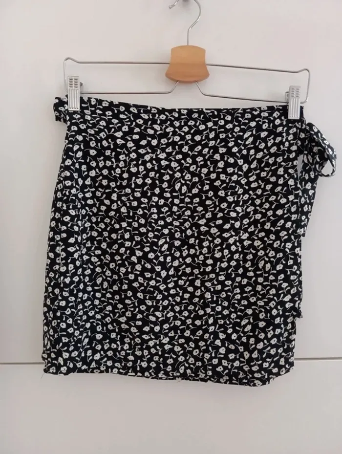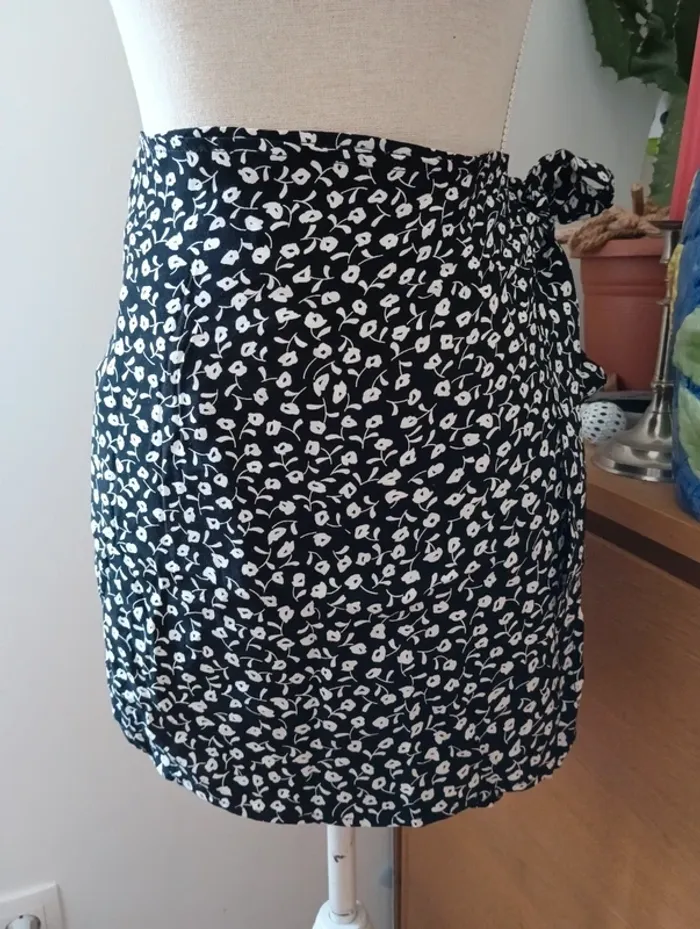Mini jupe portefeuille vintage A nouer sur le côté. Made in France Ajustable. 100% viscose Taille 36/38 à confirmer avec les mesures Mesures Taille 35 cm ajustable grâce au système portefeuille. Longueur 41cm
