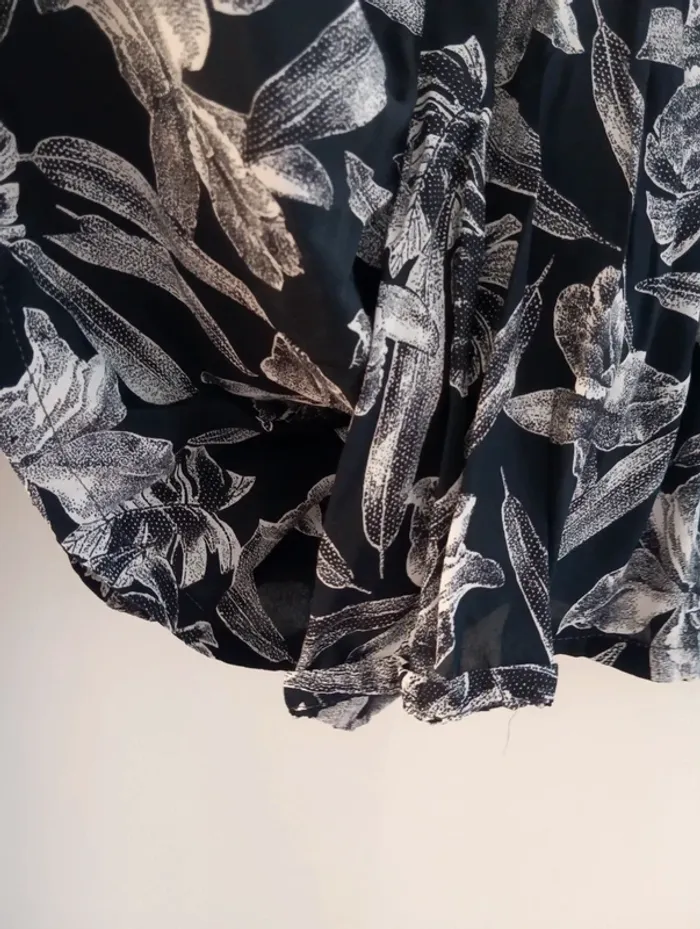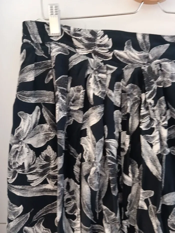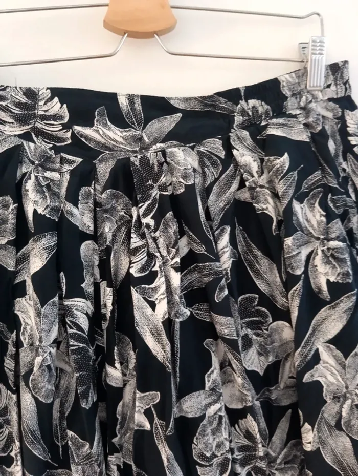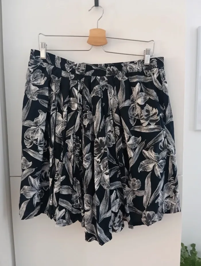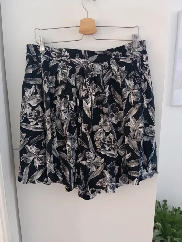 Jupe short vintage jupe culotte 100% viscose Noire grosses fleurs blanches. Taille élastique Taille 44 estimée à confirmer avec les mesures Mesures Taille extensible de 43 à 52cm longueur 51cm