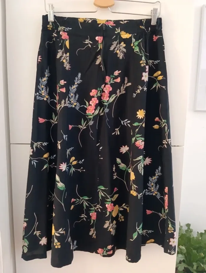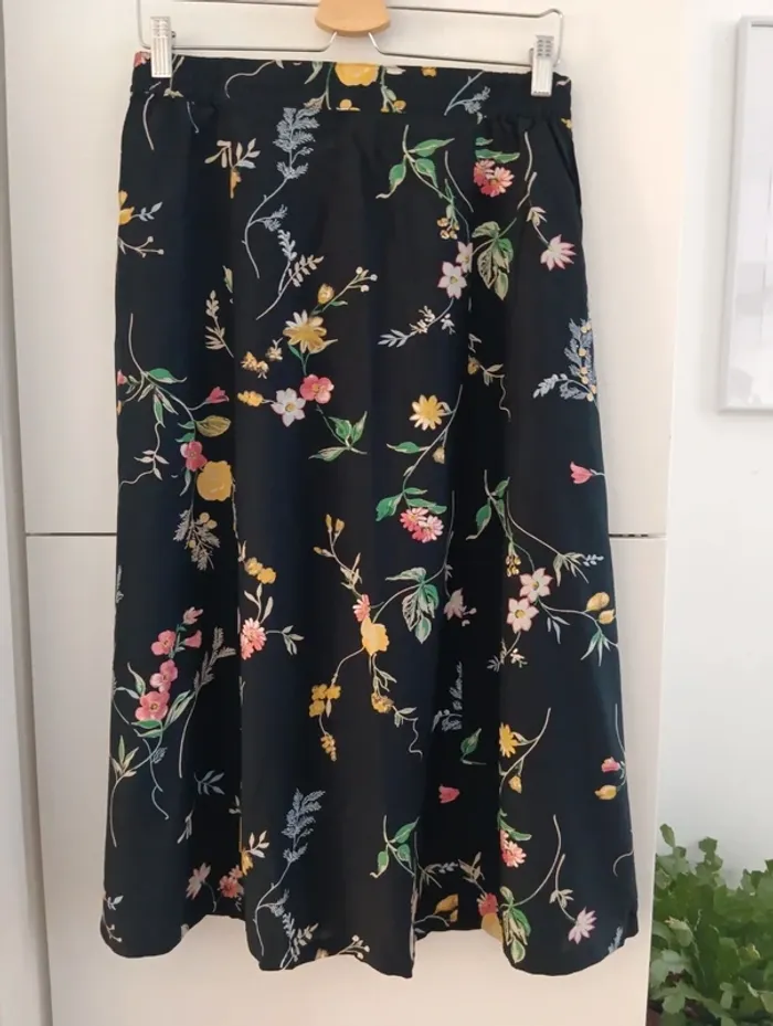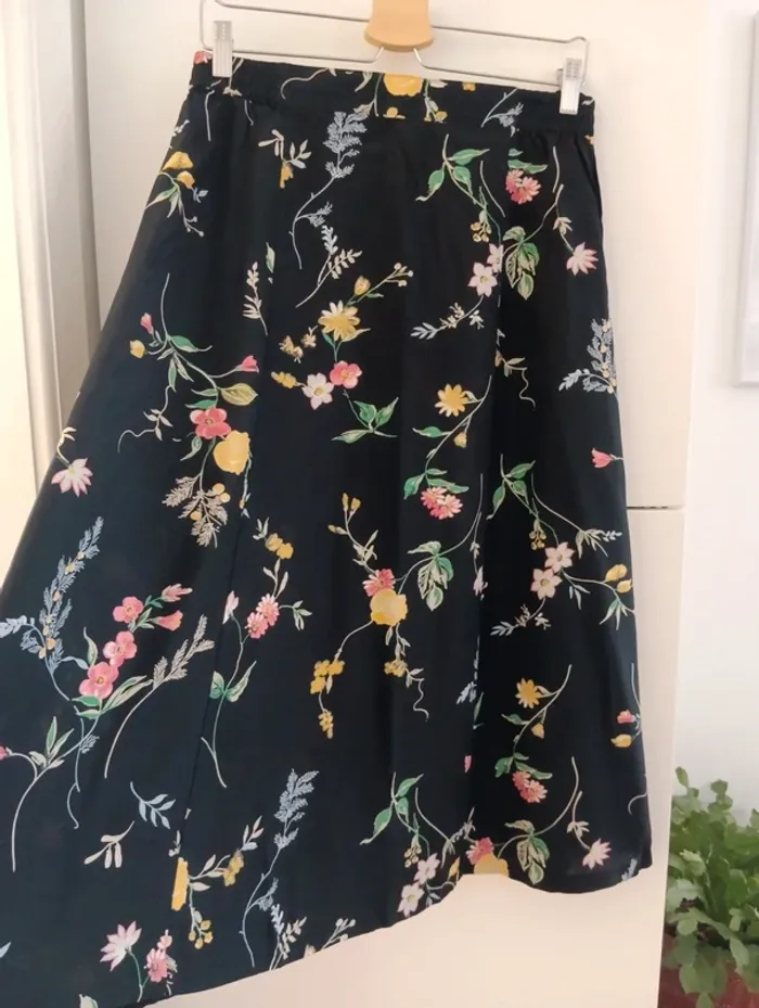 Jupe vintage midi viscose Noire, fleurs multicolores. Taille 40 estimée à confirmer avec les mesures Mesures Taille extensible de 38 à 44cm Longueur 78cm